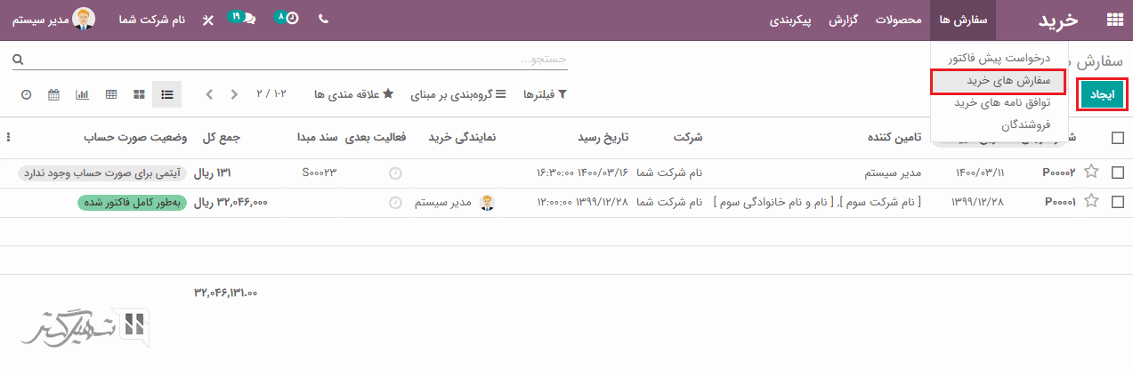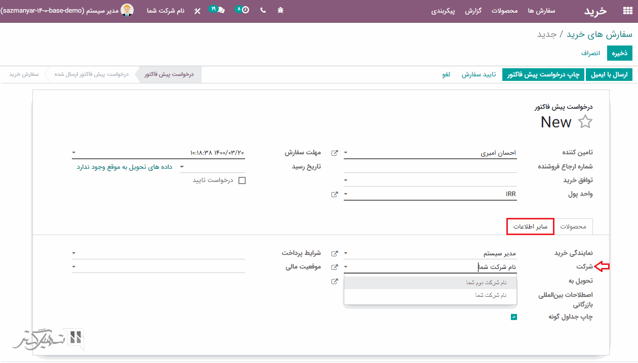 ابتدا باید ویژگی چند شرکتی را از طریق تنظیمات عمومی فعال کنید، اکنون هنگام ایجاد سفارش خرید، در تب سایر اطلاعات می توانید در فیلد شرکت، شرکت مورد نظر را انتخاب کنید: