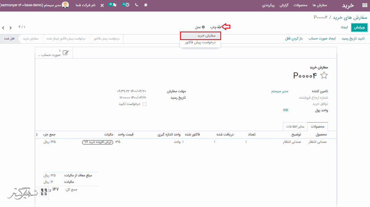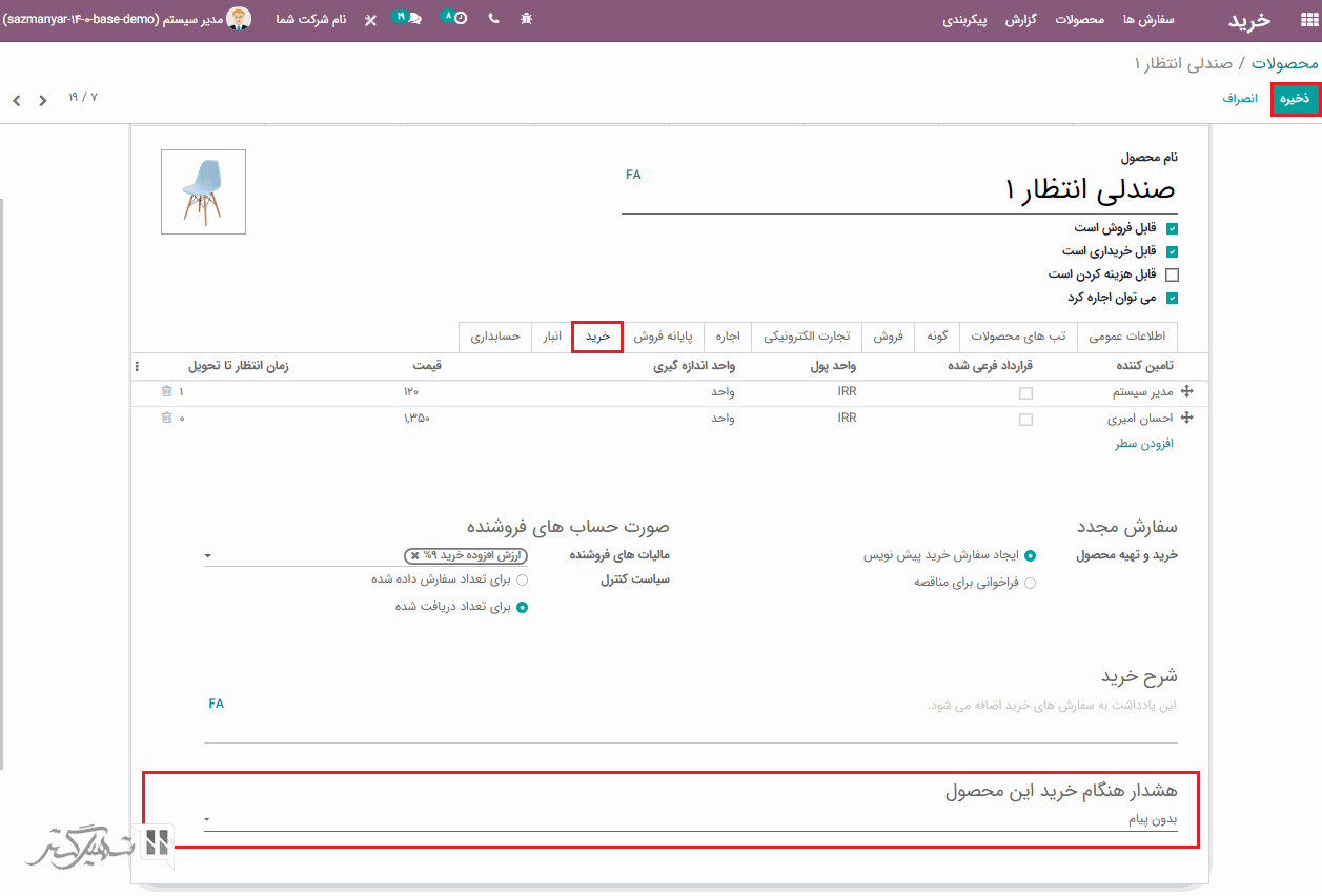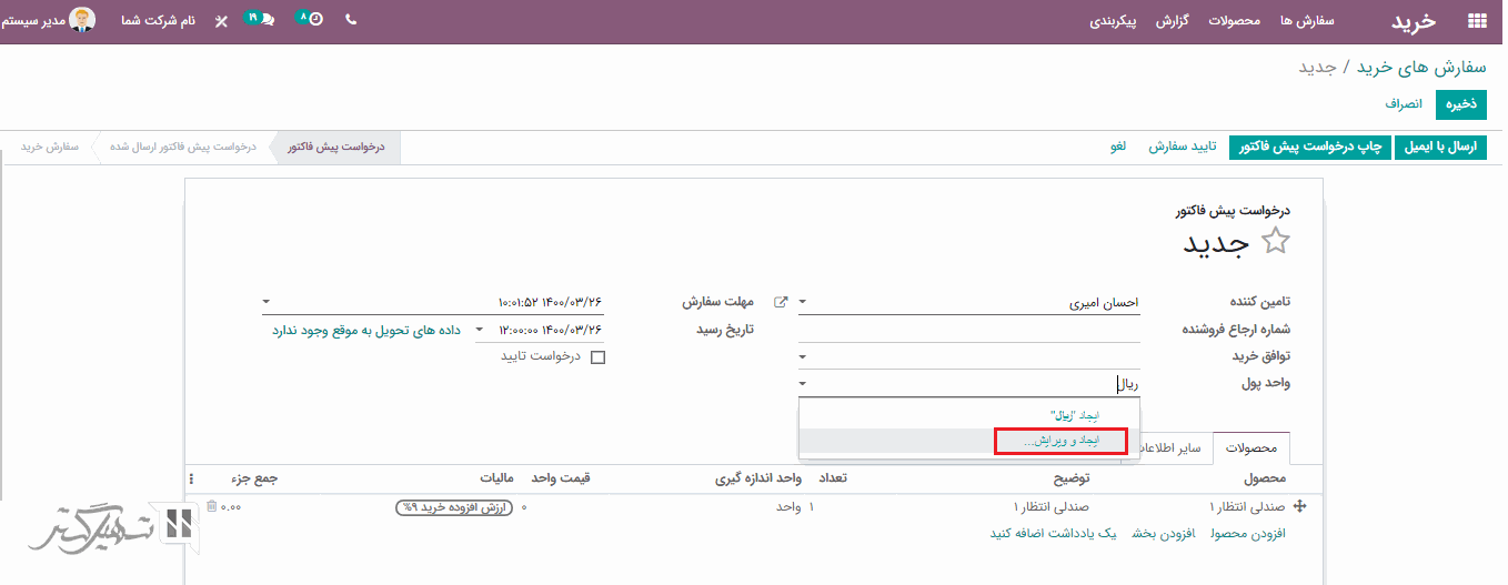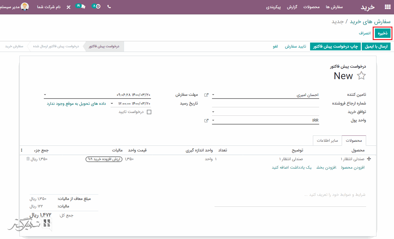 در فرم ایجاد، فیلدهای الزامی از جمله جزئیات فروشنده / تامین کننده، مهلت سفارش، تاریخ و جزئیات محصول را اضافه کرده و بر روی دکمه "ذخیره" کلیک کنید: