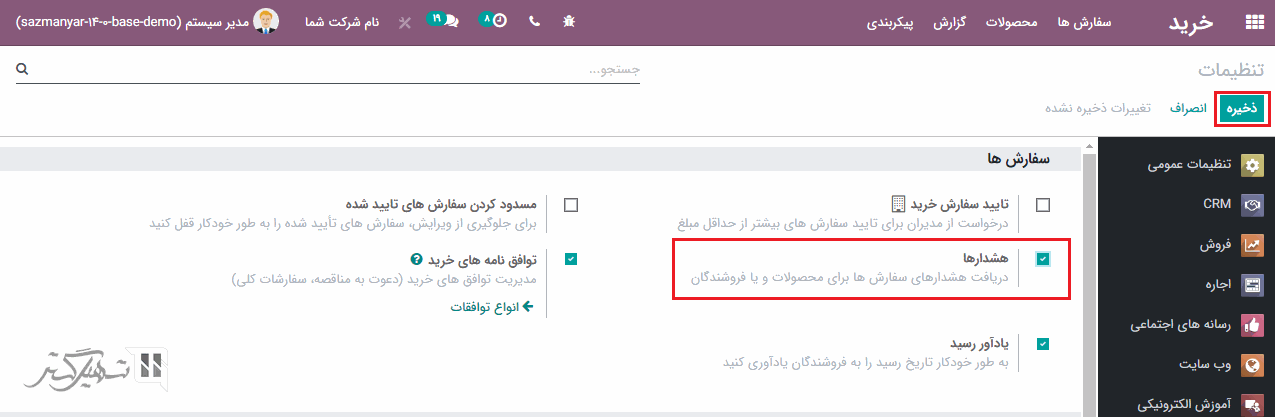 به ماژول خرید> پیکربندی> تنظیمات> تب سفارش ها بروید، ویژگی "هشدارها" را فعال کرده و بر روی دکمه "ذخیره" کلیک کنید: