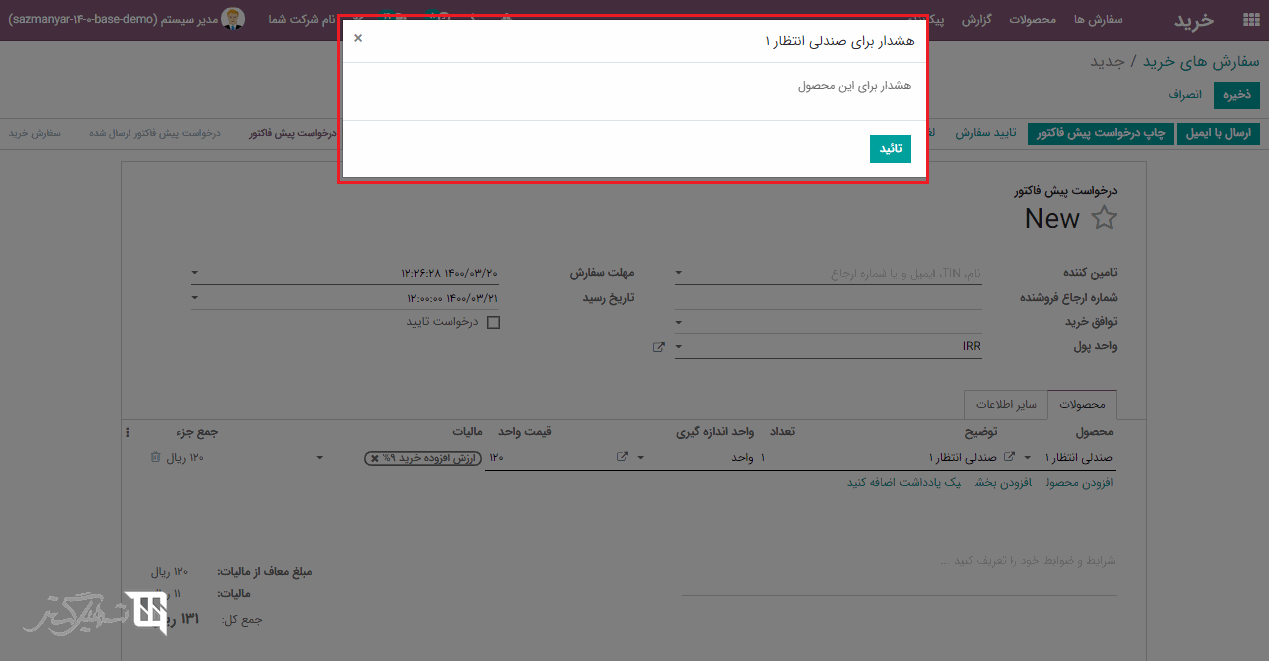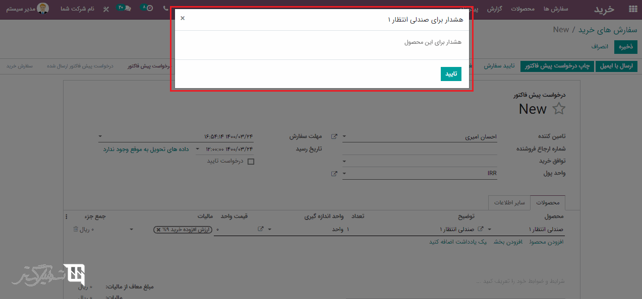 اکنون اگر یک سفارش خرید و یا پیش فاکتور ایجاد کنید و محصولی که برای آن هشدار تنظیم کرده اید را اضافه نمایید، یک پیام هشدار دریافت خواهید کرد: