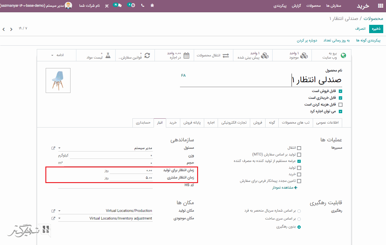زمان انتظار برای تولید و زمان انتظار مشتری در فرم محصول> تب انبار ، قابل مشاهده است. زمان انتظار مشتری ، زمان انتظاری که برای تحویل بر حسب روز وعده داده شده است. برعکس، زمان انتظار برای تولید ، زمان انتظار بر حسب روز برای تولید این محصول است.