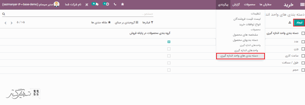 دسته بندی های واحد اندازه گیری را می توان از طریق ماژول خرید> پیکربندی> واحدهای اندازه گیری> دسته بندی های واحد اندازه گیری> کلیک بر روی دکمه "ایجاد" ، ایجاد کرد: