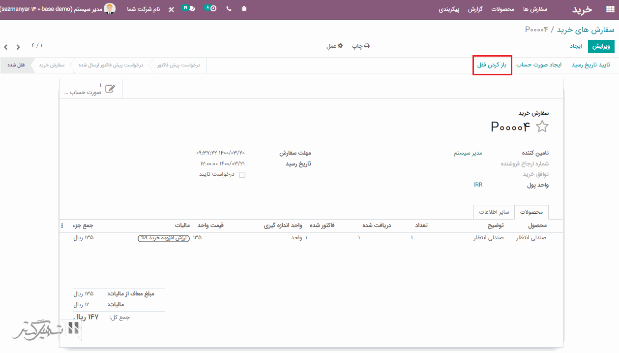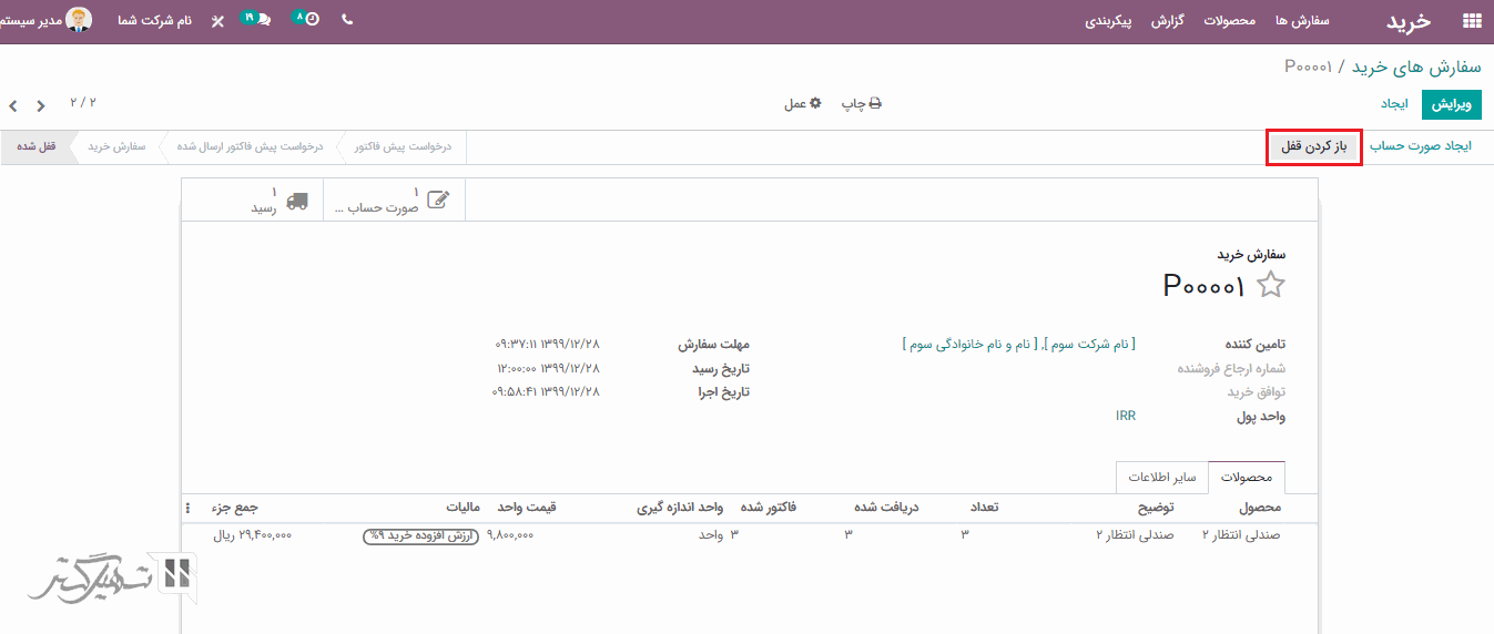 برای باز کردن قفل سفارش های خرید قفل شده، در فرم سفارش های خرید یک دکمه "بازکردن قفل" وجود دارد، کافی است بر روی آن کلیک کنید تا سفارش شما باز شود:
