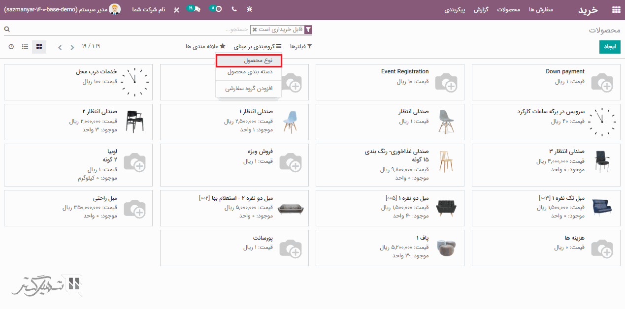 شما می توانید با استفاده از گزینه "گروه بندی بر مبنای"، محصولات را براساس "نوع محصول" گروه بندی نمایید: