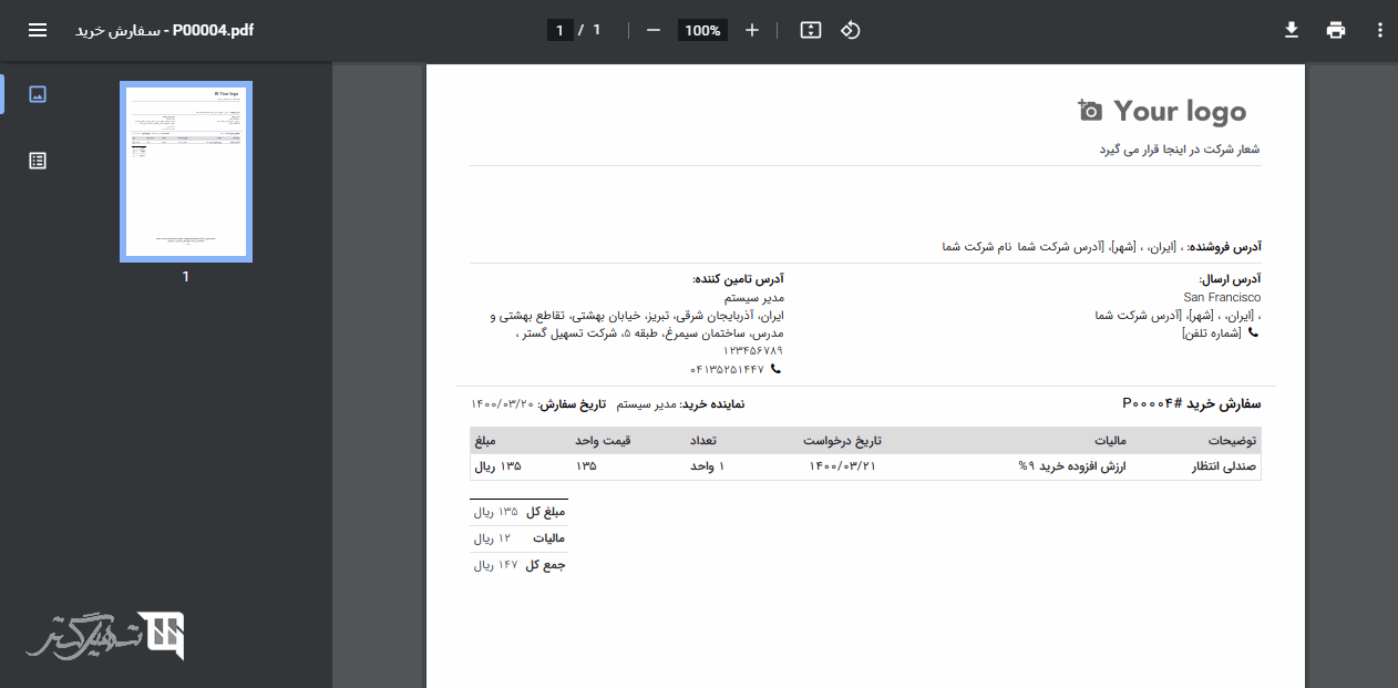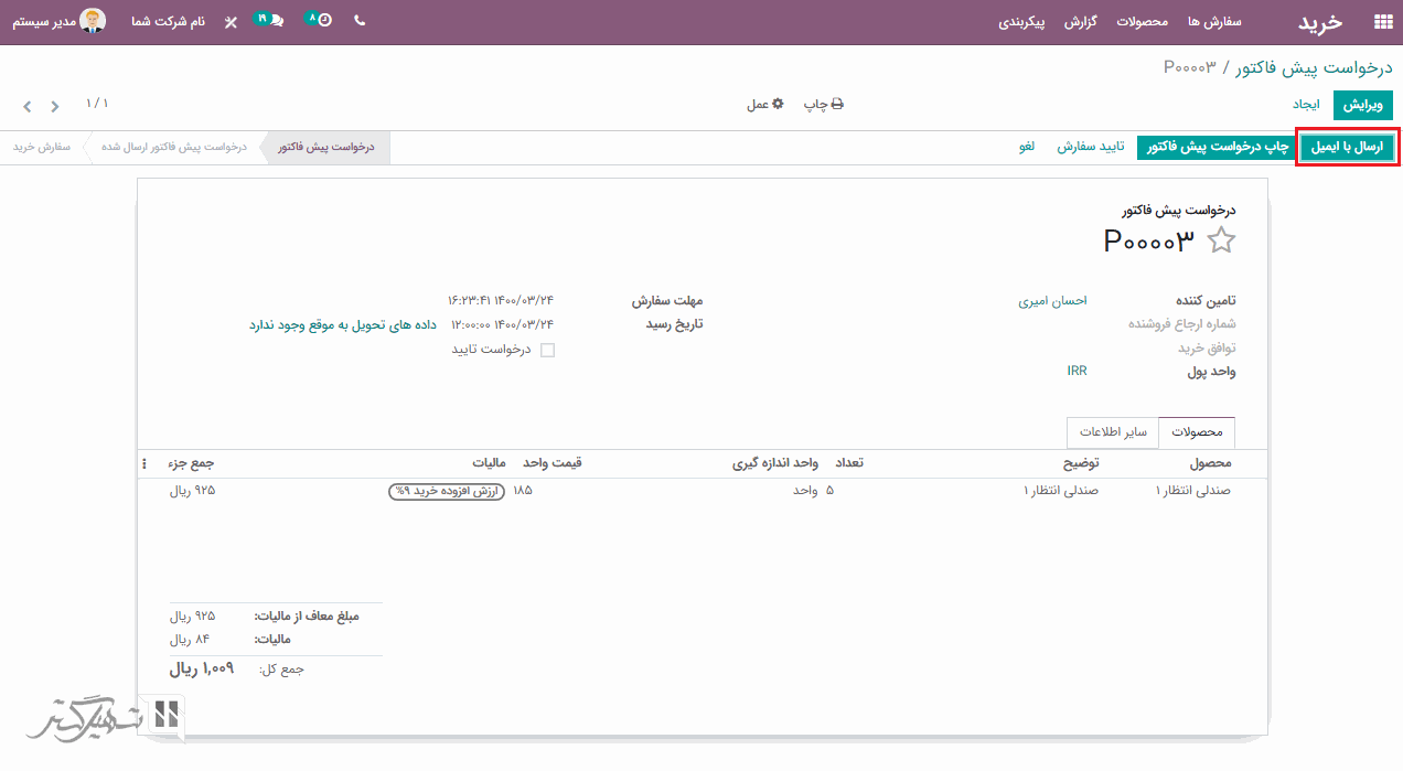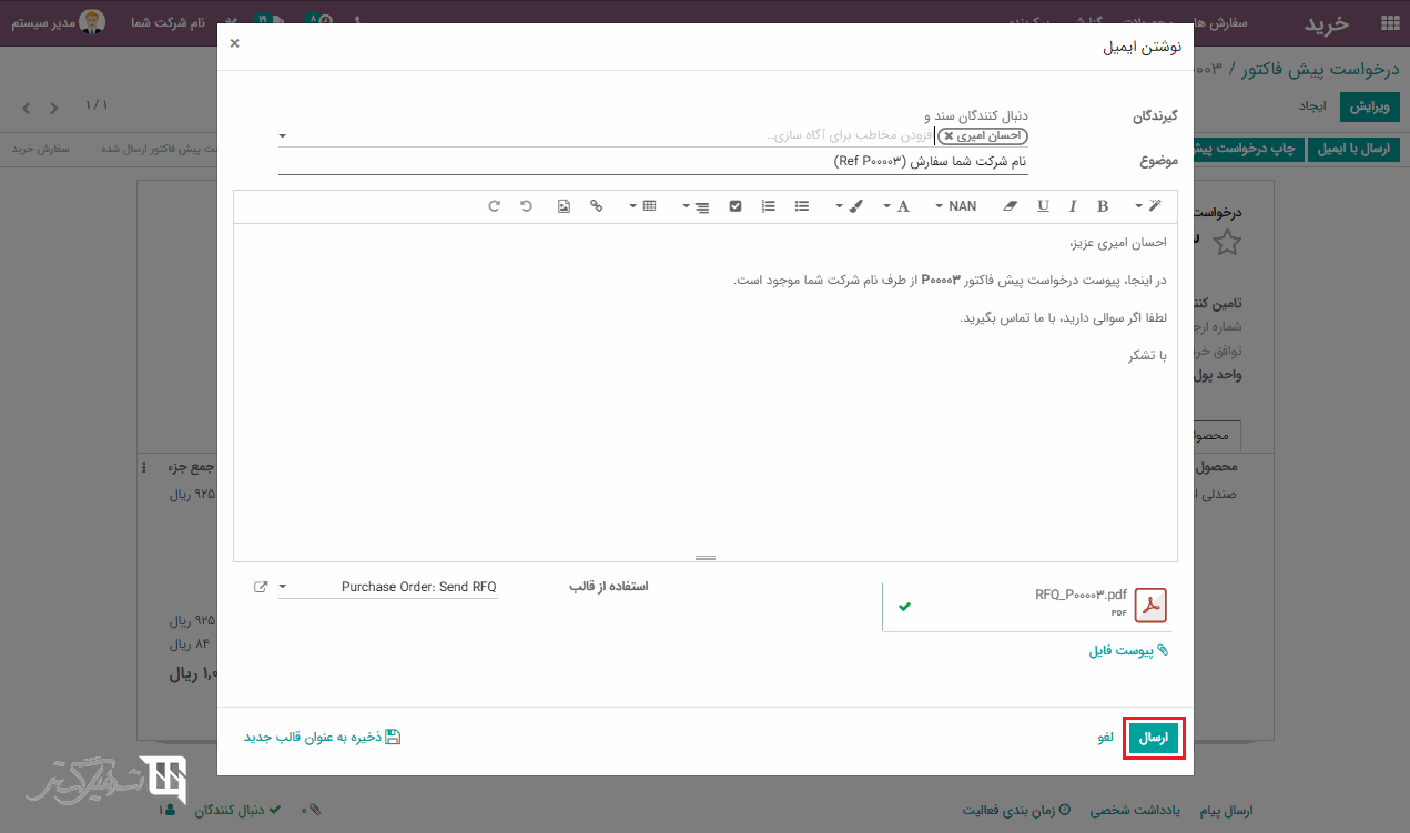 بله، پس از پر کردن تمام فیلدهای الزامی در فرم درخواست پیش فاکتور، بر روی دکمه "ارسال از طریق ایمیل" کلیک کنید تا درخواست پیش فاکتور به فروشنده ارسال شود. بدین ترتیب یک ایمیل همراه پیوست PDF درخواست پیش فاکتور به فروشنده ارسال خواهد شد. علاوه بر این، در صورت نیاز می توان اطلاعات بیشتری را در توضیحات قالب ایمیل اضافه کرده و به فروشنده ارسال نمایید: