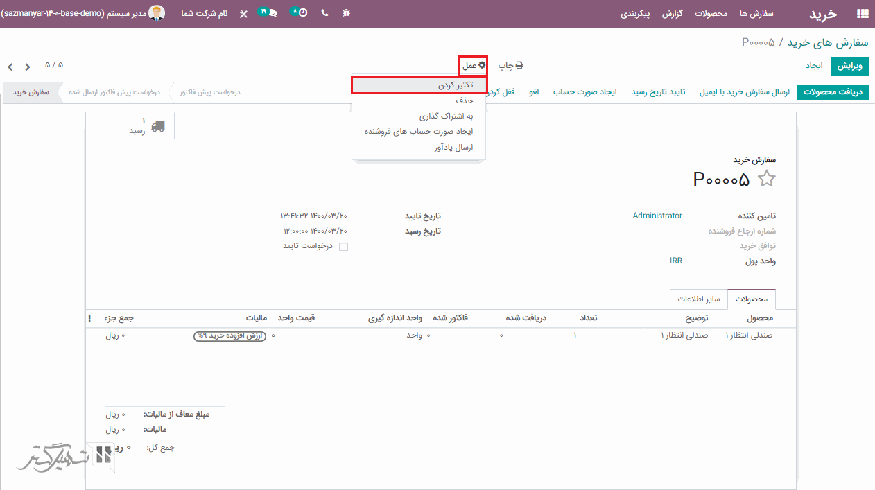 سفارش خریدی که رسید آن تایید شده باشد و یا برخی محصولات تحویل داده شده باشند، نمی توان آن را مستقیما حذف کرد، برای حذف یک سفارش خرید ابتدا باید آن را با کلیک بر روی دکمه "لغو" ، لغو نمایید، سپس از طریق دکمه "عمل" ، بر روی دکمه "حذف" کلیک کنید: