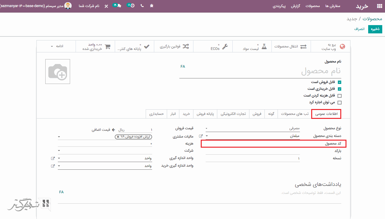 در فرم هر محصول، یک فیلد "کد محصول" برای شناسایی محصول در داخل شرکت وجود دارد:
