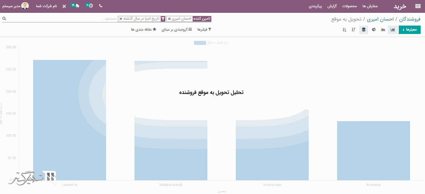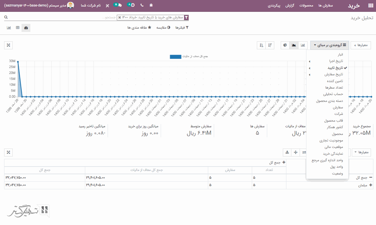 از طریق ماژول خرید> گزارش، می توانید انواع گزارش ها از جمله گزارش خطی، دایره ای، میله ای را با استفاده از گزینه های فیلترها و گروه بندی بر مبنای تهیه کنید: