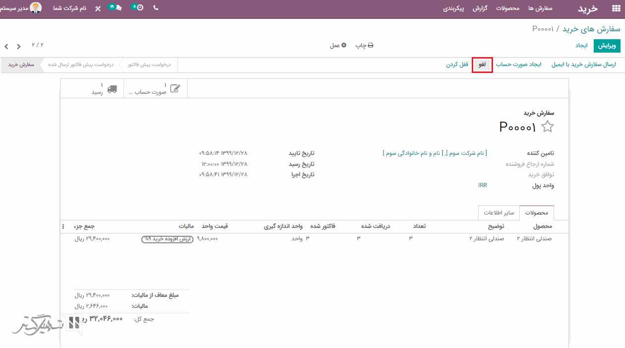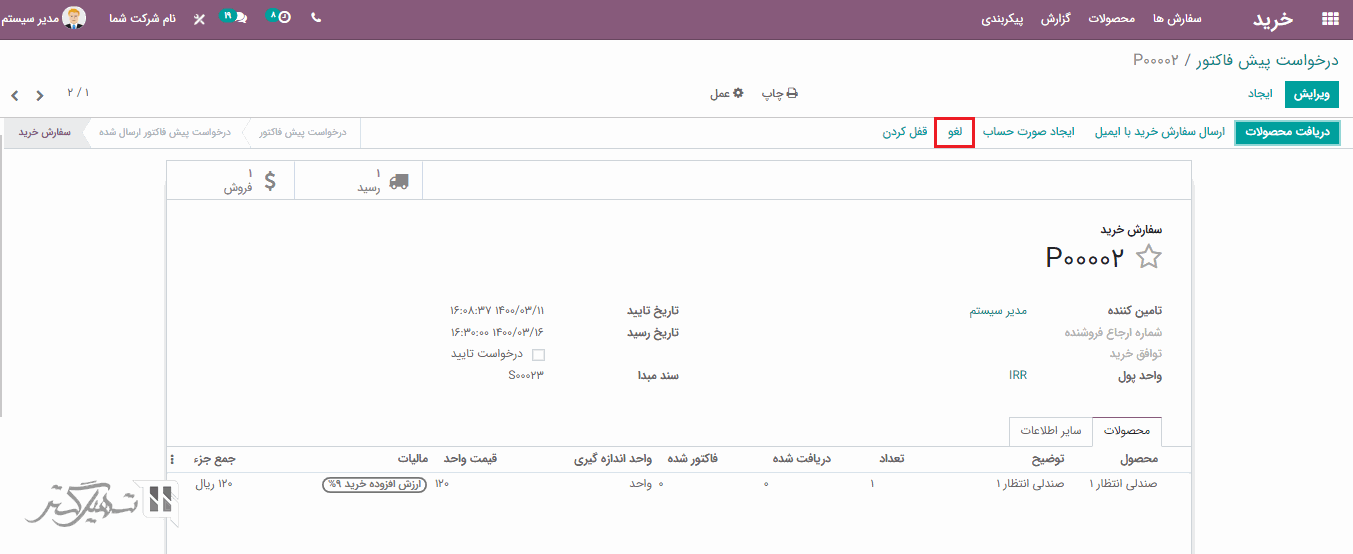 و یا اگر درخواست پیش فاکتور تایید و به سفارش فروش تبدیل شده باشد، ابتدا باید سفارش خرید را با کلیک بر روی دکمه "لغو" ، لغو کنید: