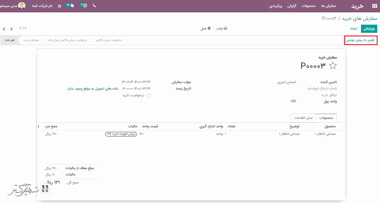 می توانید با کلیک بر روی دکمه "ویرایش" موجود در فرم درخواست پیش فاکتور مربوطه، آن را ویرایش کرده و جزئیات مورد نظر را در آن اضافه کنید. سپس مجددا آن را به فروشنده ارسال نمایید.