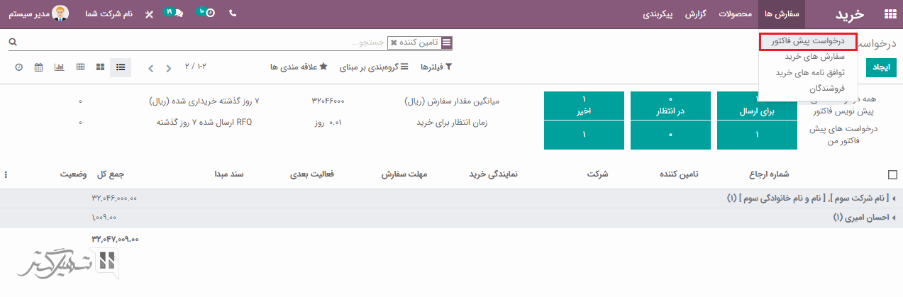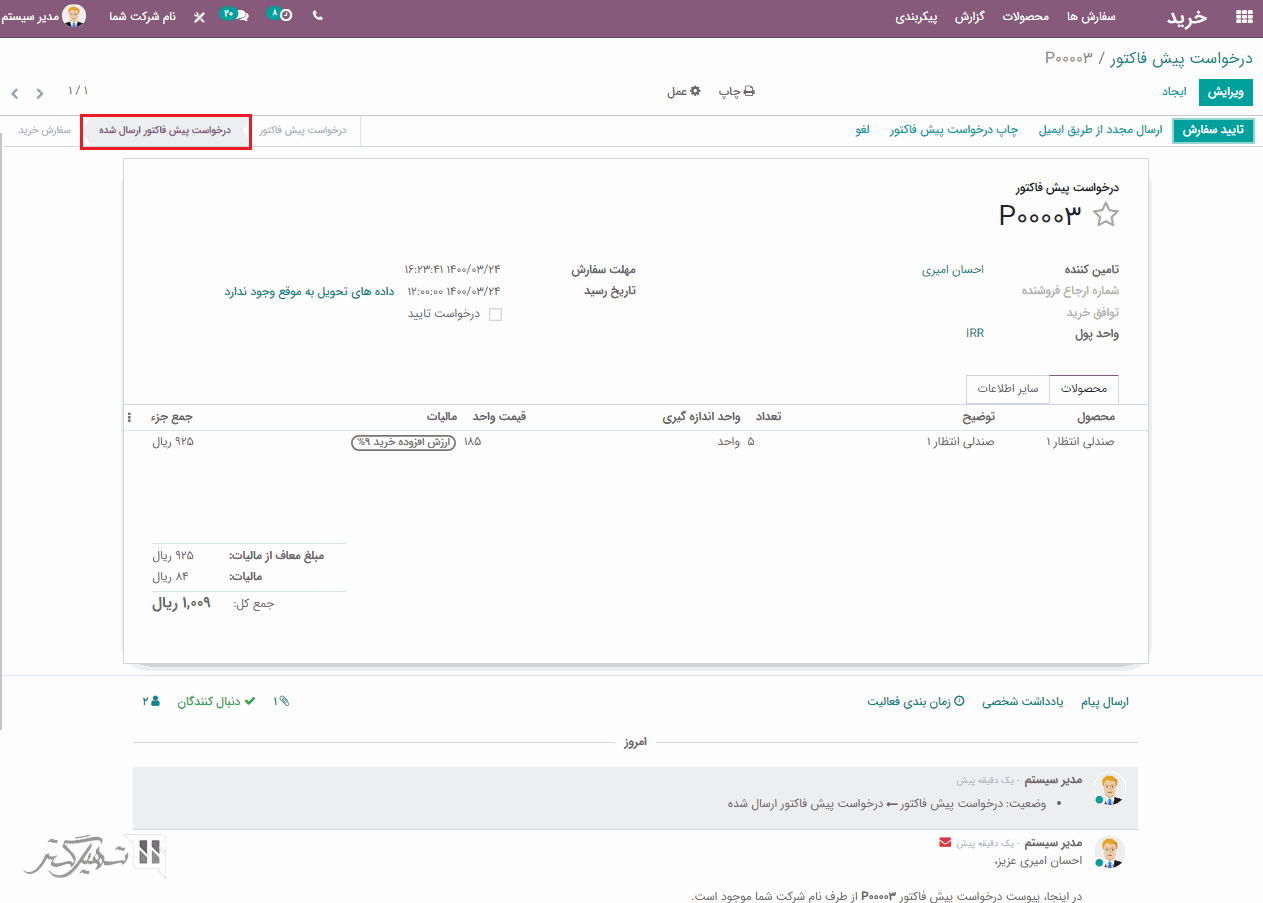 در نهایت پس از ارسال درخواست پیش فاکتور به فروشنده، وضعیت پیش فاکتور به "درخواست پیش فاکتور ارسال شده" تغییر خواهد یافت: