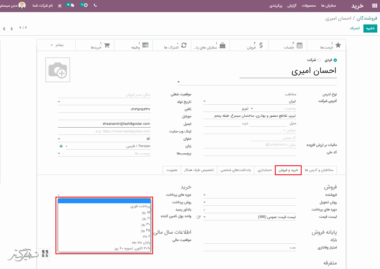 شما می توانید از طریق ماژول خرید> سفارش ها> فروشندگان> تب خرید و فروش ، دوره های پرداخت را برای فروشندگان خود تنظیم کنید: