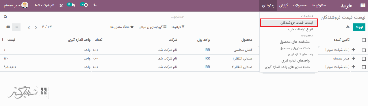برای ایمپورت کردن لیست قیمت فروشندگان، به ماژول خرید> پیکربندی> لیست قیمت فروشندگان بروید: