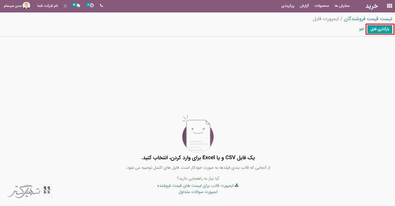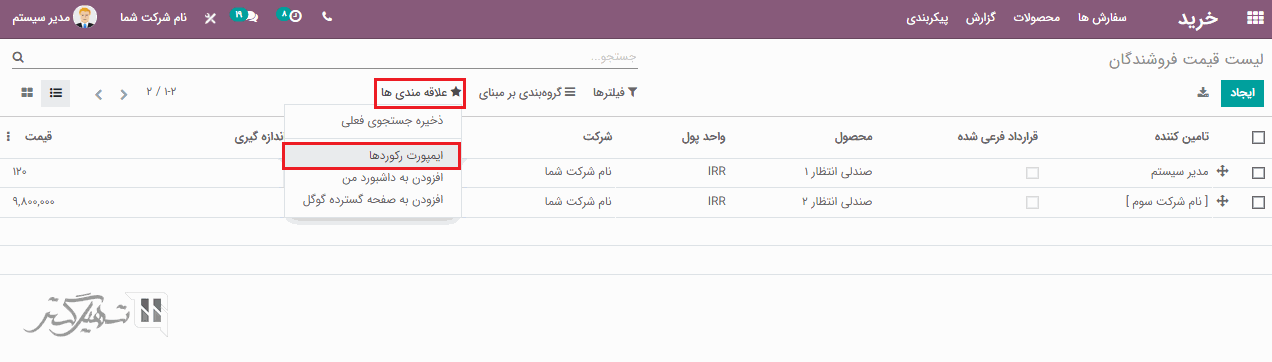 در آنجا تمامی لیست های قیمت قابل مشاهده است، برای ایمپورت کردن لیست قیمت جدید، در زیر منوی کشویی "علاقه مندی ها" ، بر روی "ایمپورت رکوردها" کلیک کرده و فایل مورد نظر را با استفاده از دکمه "بارگذاری فایل" ، بارگذاری کنید: