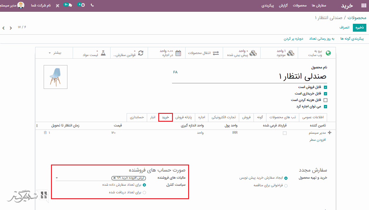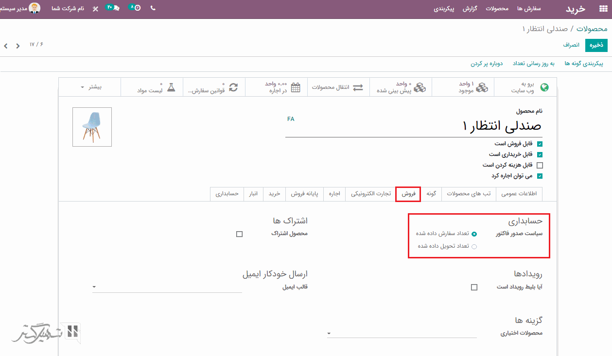 علاوه بر این، اگر در تب فروش محصول، سیاست صدور فاکتور بر اساس "تعداد سفارش داده شده" باشد، می توان صورت حساب را قبل از دریافت محصول ایجاد کرد: