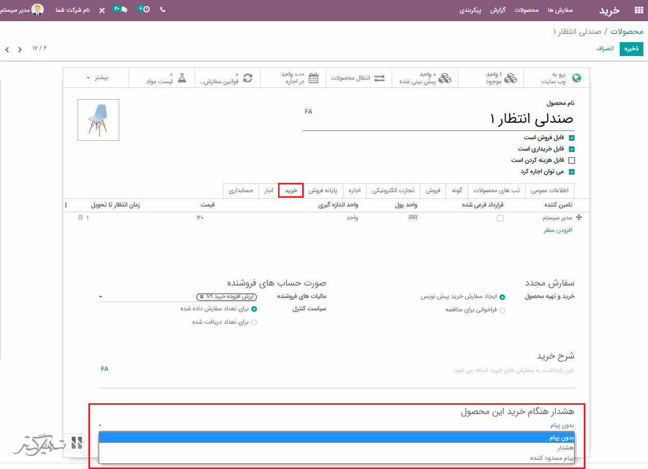 بله، در تب خرید فرم محصول، می توانید یک هشدار یا پیام مسدود کننده برای محصول تنظیم کنید تا هنگام ایجاد سفارش خرید برای این محصول، هشدار یا پیام مسدود کننده ظاهر شود: