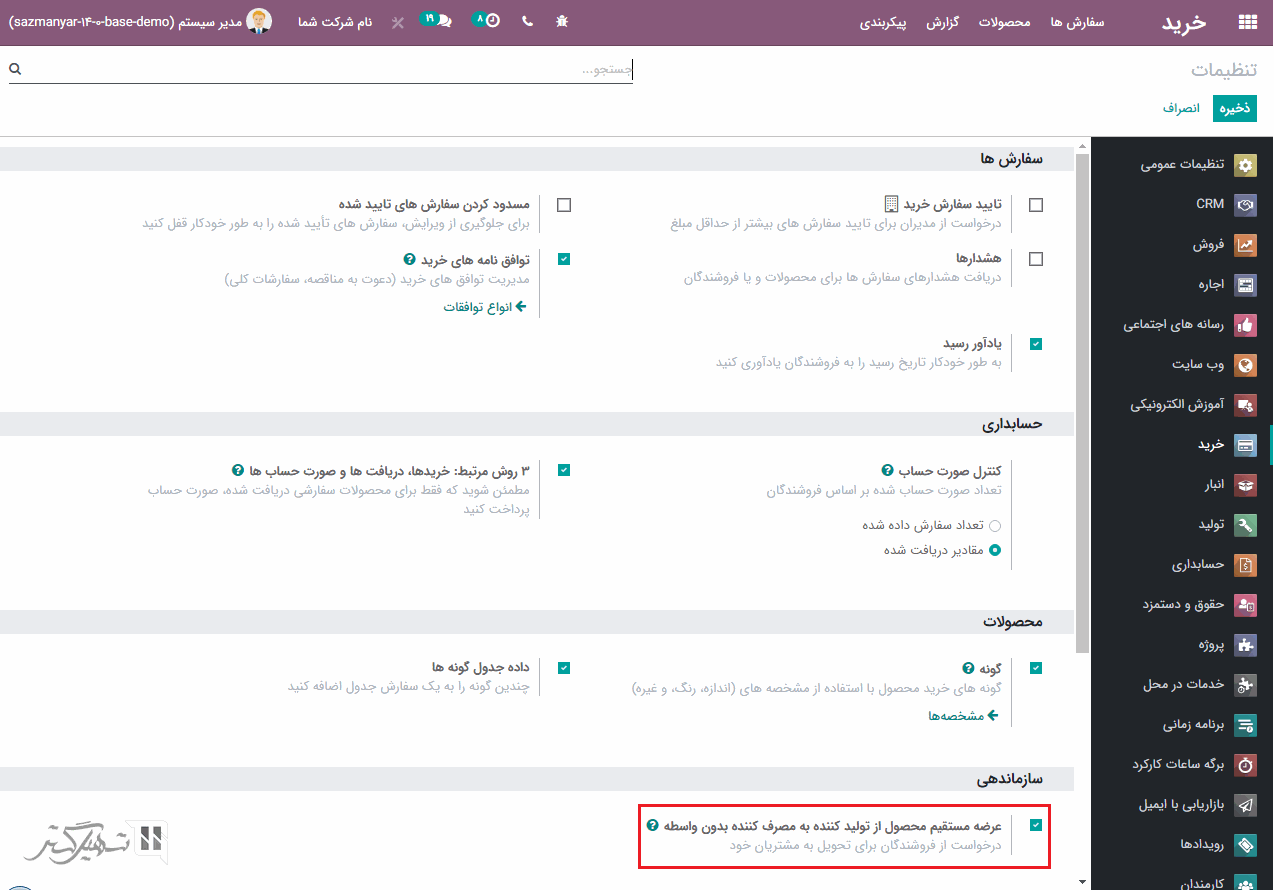 "Dropshipping" فرآیند ارسال مستقیم محصولات از فروشنده به مشتری بدون واسطه است تا موجودی تحت تأثیر قرار نگیرد. در مرحله اول از طریق ماژول خرید> پیکربندی> تنظیمات> تب سازماندهی ، گزینه "عرضه مستقیم محصول از تولید کننده به مصرف کننده بدون واسطه" را فعال کرده و بر روی دکمه "ذخیره" کلیک کنید: