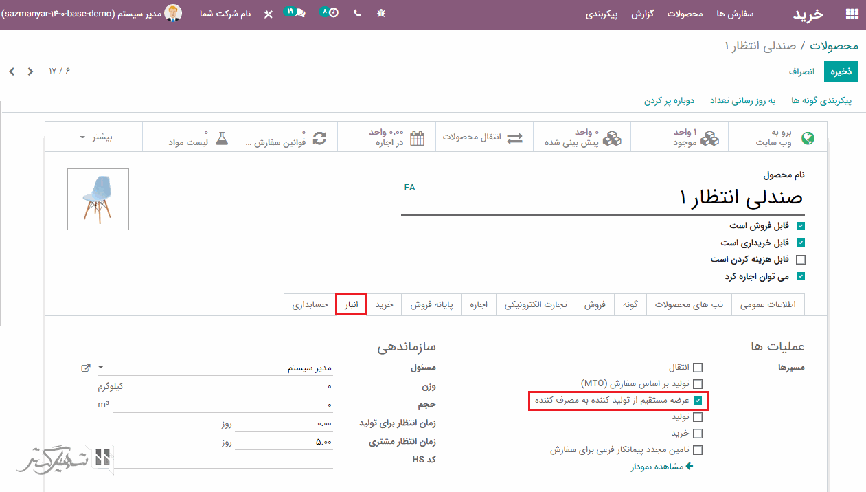 پس از فعالسازی، یک مسیر جدید در تب انبار فرم محصول ظاهر خواهد شد. برای فروش آن دسته از محصولاتی که می خواهید از طریق فرآیند عرضه مستقیم از تولید کننده به مصرف کننده به فروش برسند، ابتدا از طریق تب انبار فرم محصول، مسیر "عرضه مستقیم از تولید کننده به مصرف کننده" را فعال کرده، سپس تامین کنندگان را در تب خرید اضاف نمایید. اکنون هر زمان که یک فروش تأیید شود، یک درخواست پیش فاکتور خرید از فروشنده به مشتری ایجاد می شود که مشتری می تواند آن را تایید و دریافت کند.