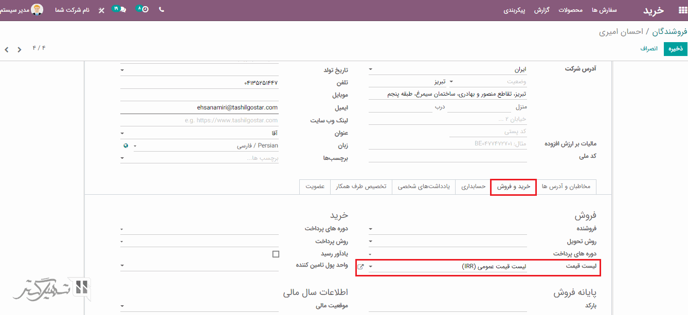 از طریق ماژول خرید> سفارش ها> فروشندگان، می توانید در تب خرید و فروش فرم فروشندگان، لیست قیمت مورد نظر را اضافه کرده سپس بر روی دکمه "ذخیره" کلیک کنید: