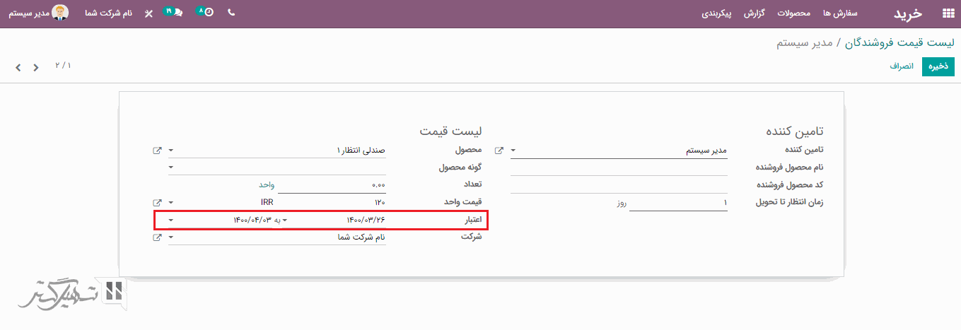 با ایجاد لیست قیمت از طریق ماژول خرید> پیکربندی> لیست قیمت فروشندگان ، می توانید در داخل فرم ایجاد، اعتبار لیست قیمت را نیز در فیلد "اعتبار" اضافه نمایید: