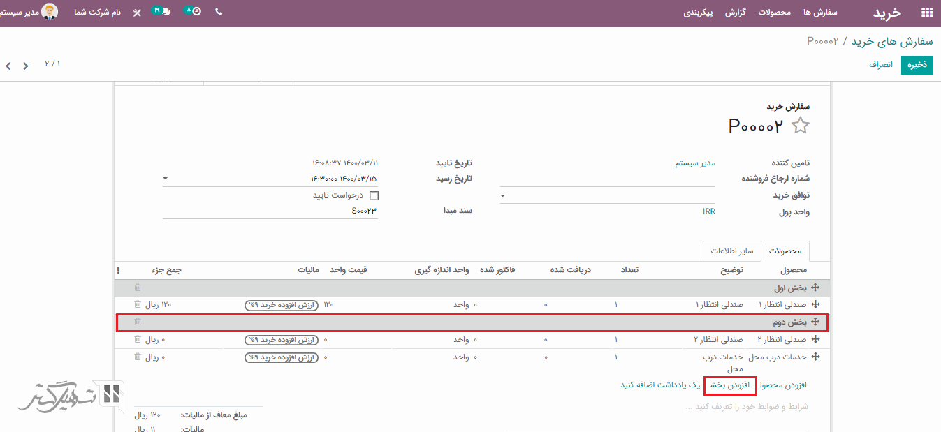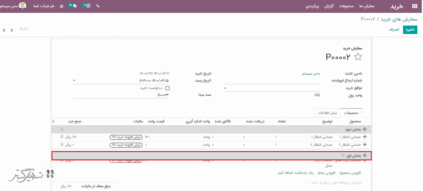هنگام افزودن محصولات در سطرهای سفارش خرید و یا درخواست پیش فاکتور، بر روی "افزودن بخش" کلیک کنید و نامی برای بخش اضافه نمایید. سپس می توانید محصولات و یا بخش ها را در سطر های سفارش به دلخواه جا به جا کنید:
