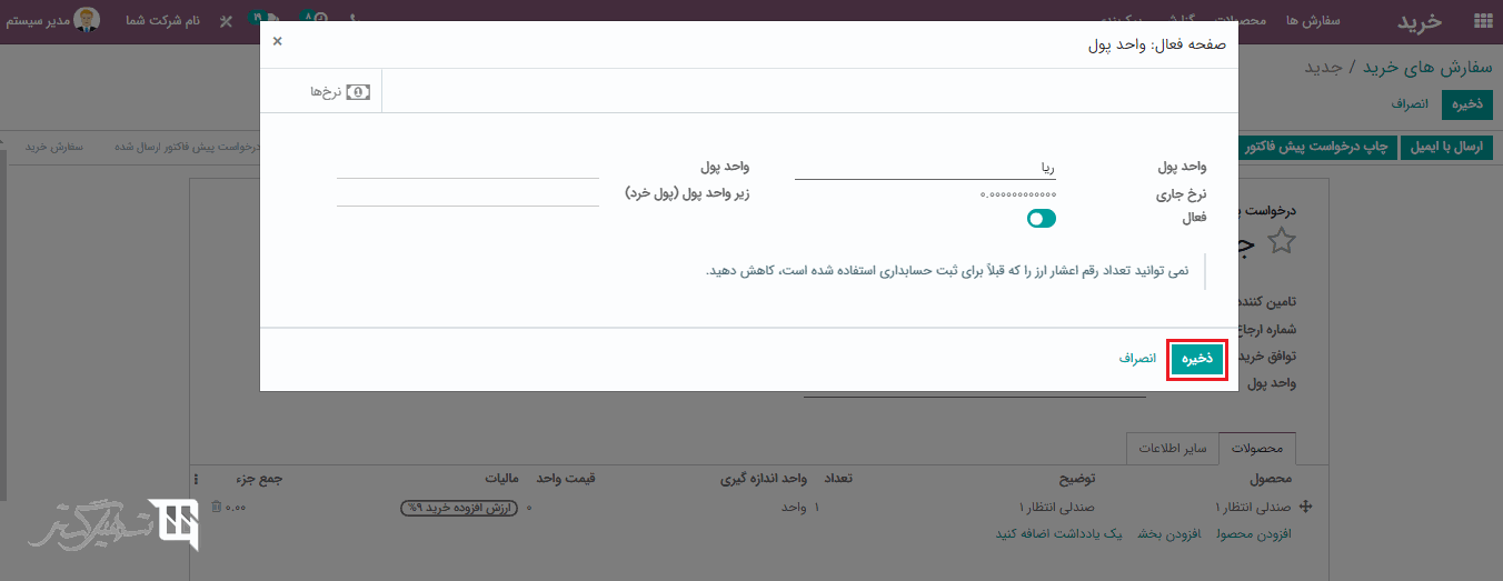 بله، می توانید از طریق زیر منوی فیلد "واحد پول" ، واحد های پول تنظیم شده در حسابداری را فعال و استفاده کنید: