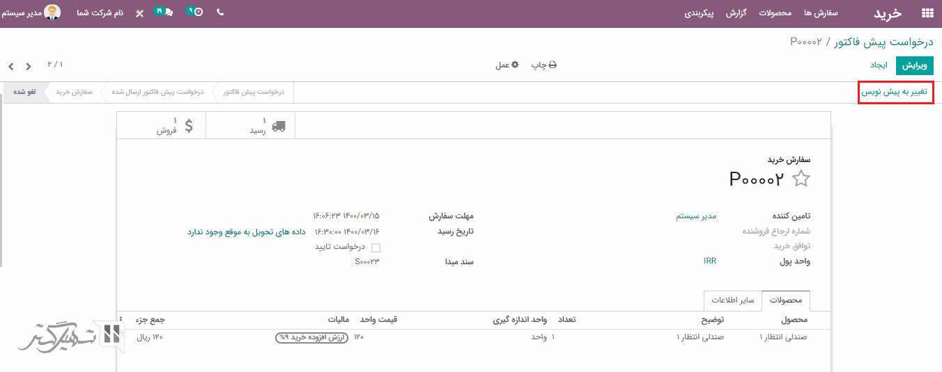 سپس با کلیک بر روی دکمه "تغییر به پیش نویس" ، آن را به حالت پیش نویس برگردانید و تغییرات لازم را در آن اعمال کنید، اکنون می توانید از طریق دکمه "تایید سفارش"، سفارش خرید را تایید کرده و مجددا آن را به طرف همکار مربوطه ارسال نمایید: