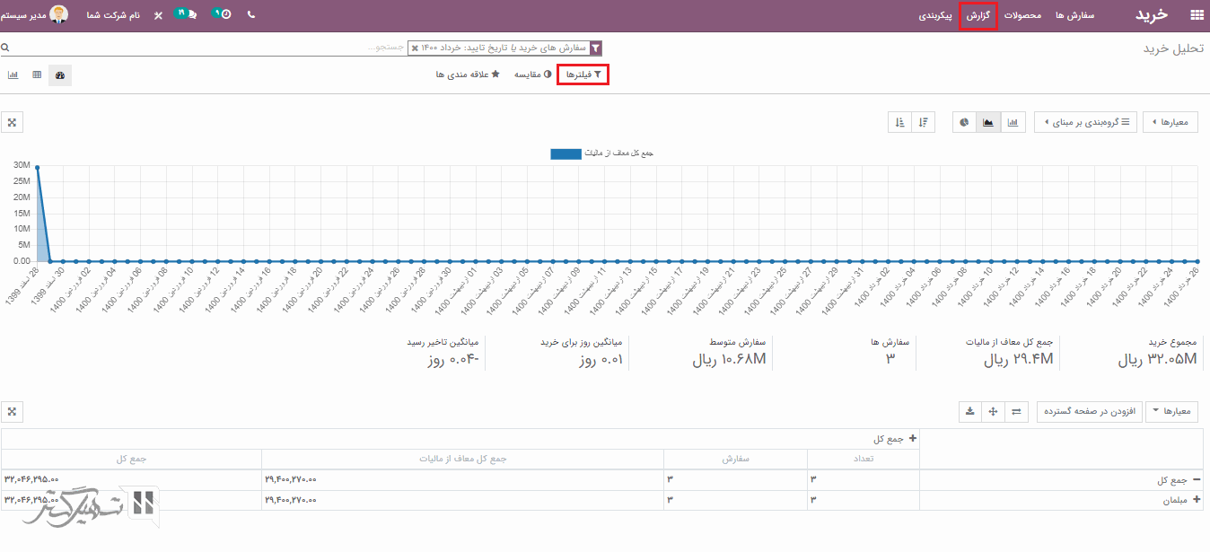 از نمای محوری ماژول خرید> گزارش ، می توانید سفارشات خرید را با استفاده از گزینه "فیلتر" ، براساس تاریخ سفارش (می تواند ماهانه، هفتگی یا روز باشد)، فیلتر کنید: