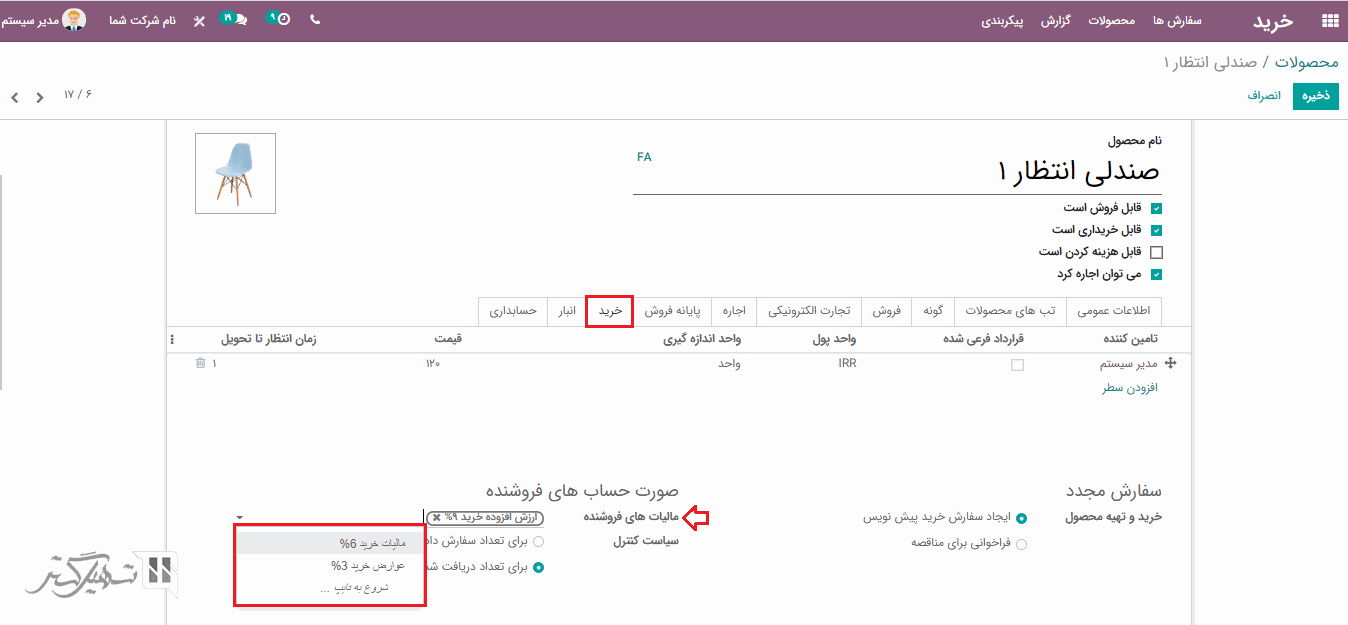 هنگام ایجاد محصول جدید، می توانید مالیات آن را نیز از طریق تب خرید> فیلد مالیات های فروشنده اضافه نمایید: