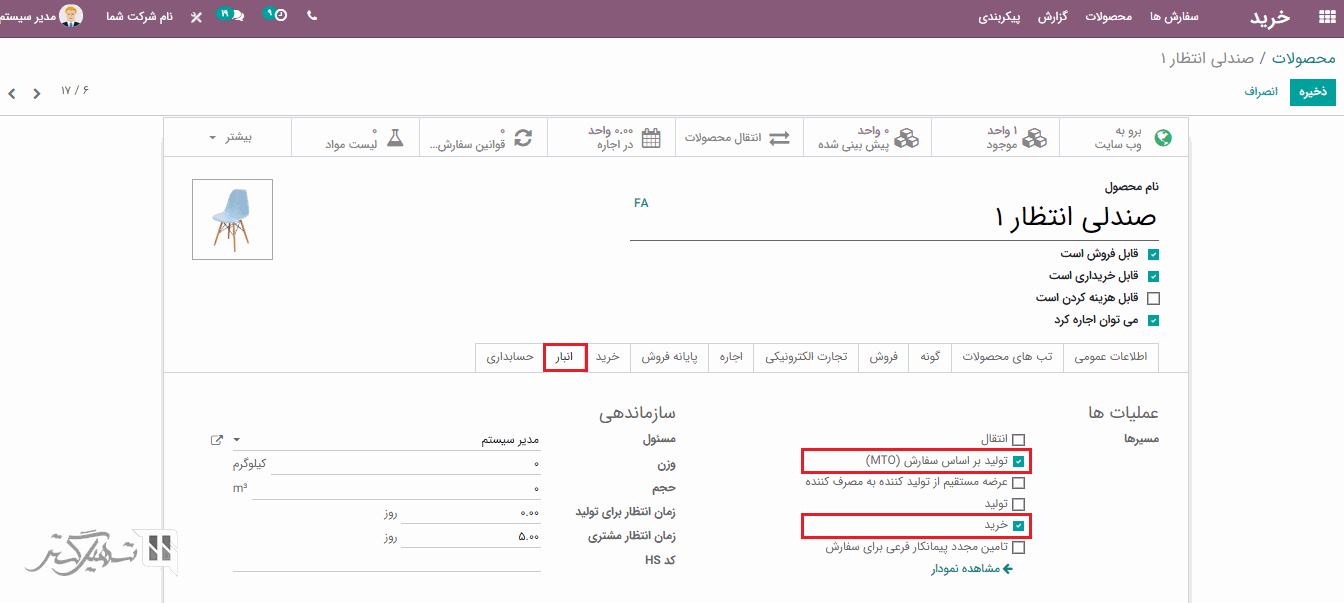 ابتدا باید در تب انبار فرم محصول مورد نظر، مسیرهای خرید و تولید بر اساس سفارش(MTO) را فعال کنید. اکنون هنگامی که شما برای محصول مربوطه سفارش فروش ایجاد کنید، درخواست پیش فاکتور خرید به صورت خودکار برای خرید تعداد مورد نیاز محصول ایجاد خواهد شد: