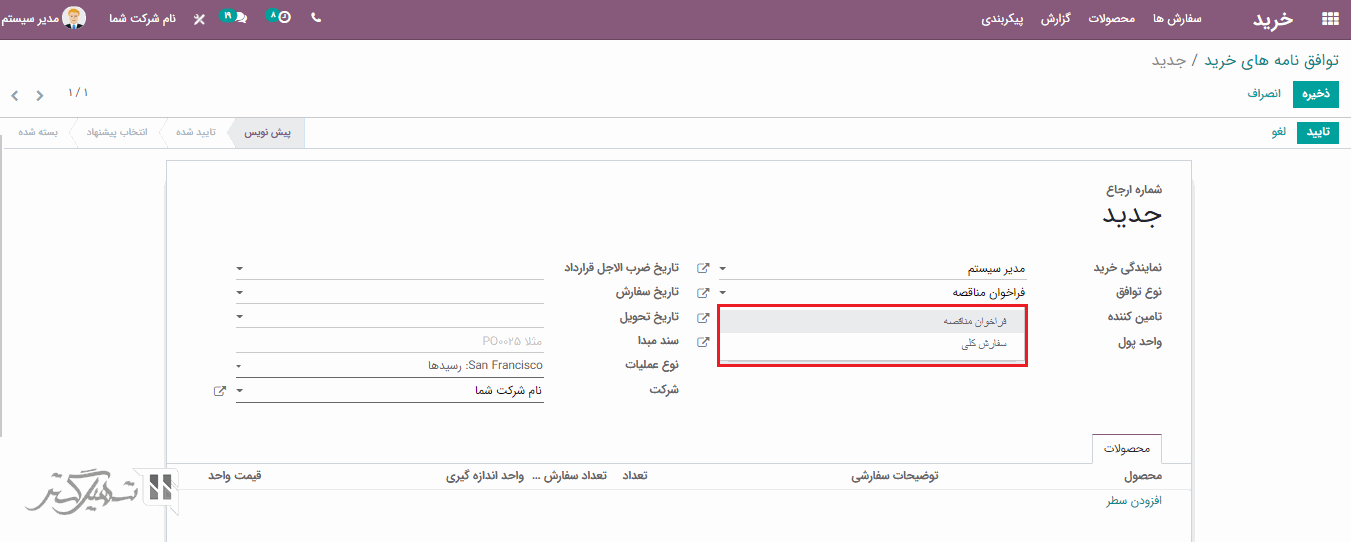 ماژول خرید اودوو 14 دو نوع توافق نامه خرید ارائه داده است: