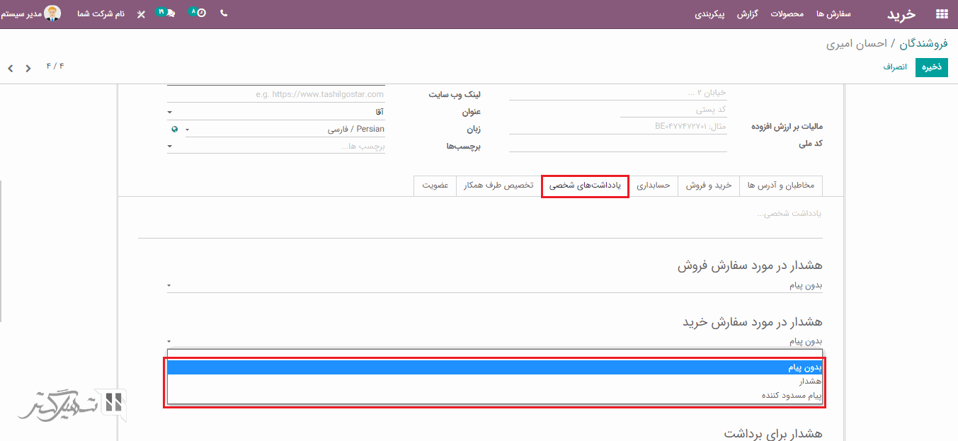 بله، از طریق ماژول خرید> سفارش ها> فروشندگان ، فروشنده مربوطه را انتخاب کرده، سپس در تب یادداشت های شخصی، می توانید یک هشدار یا پیام مسدود کننده در فیلد هشدار در مورد سفارش خرید برای این فروشنده تنظیم نمایید: