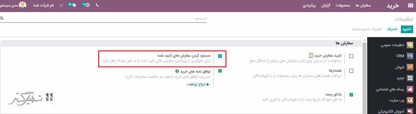ابتدا از طریق ماژول خرید> پیکربندی> تنظیمات ، ویژگی "مسدود کردن سفارش های تایید شده" را فعال کنید. با فعالسازی این گزینه، سفارش های تایید شده به طور خودکار قفل خواهند شد: