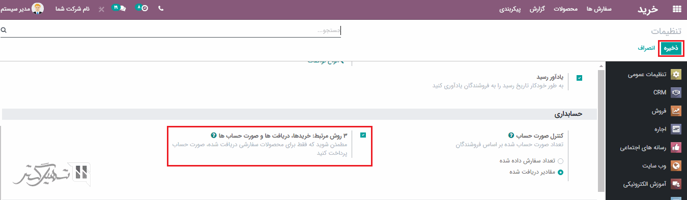 ابتدا از طریق ماژول خرید> پیکربندی> تنظیمات> تب سفارش ها ، ویژگی "تایید سفارش خرید" را فعال کرده و حداقل مبلغ (زمانی که سفارش خرید بیشتر از مبلغ حداقل باشد، نیاز به تأیید مدیر دارد.) را تعیین کنید، سپس بر روی دکمه "ذخیره" کلیک نمایید: