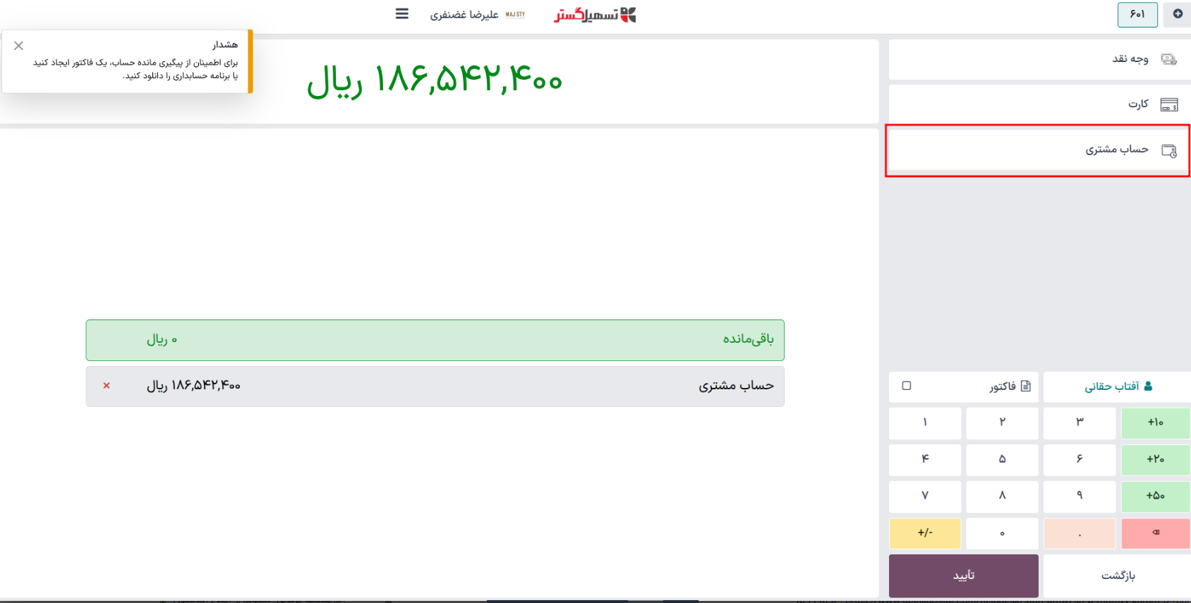 برای این مورد کافیست در پرداخت پایانه فروش از روش پرداخت "حساب مشتری" پرداخت صورت گیرد.