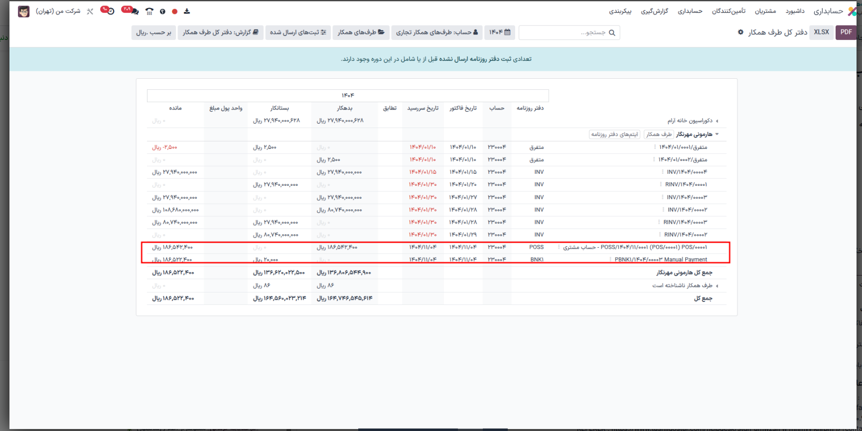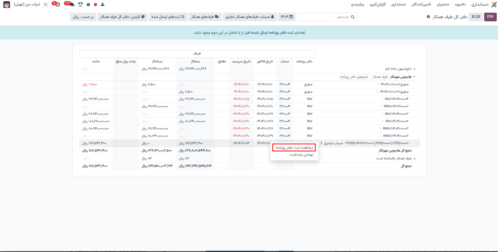 3 ) سپس برای مشاهده ثبت میتوانید از مسیر حسابداری -> گزارش گیری -> گزارش های طرف همکار -> دفتر کل طرف همکار مطابق عکس پیوستی ثبت دفتر روزنامه را مشاهده نمایید.
