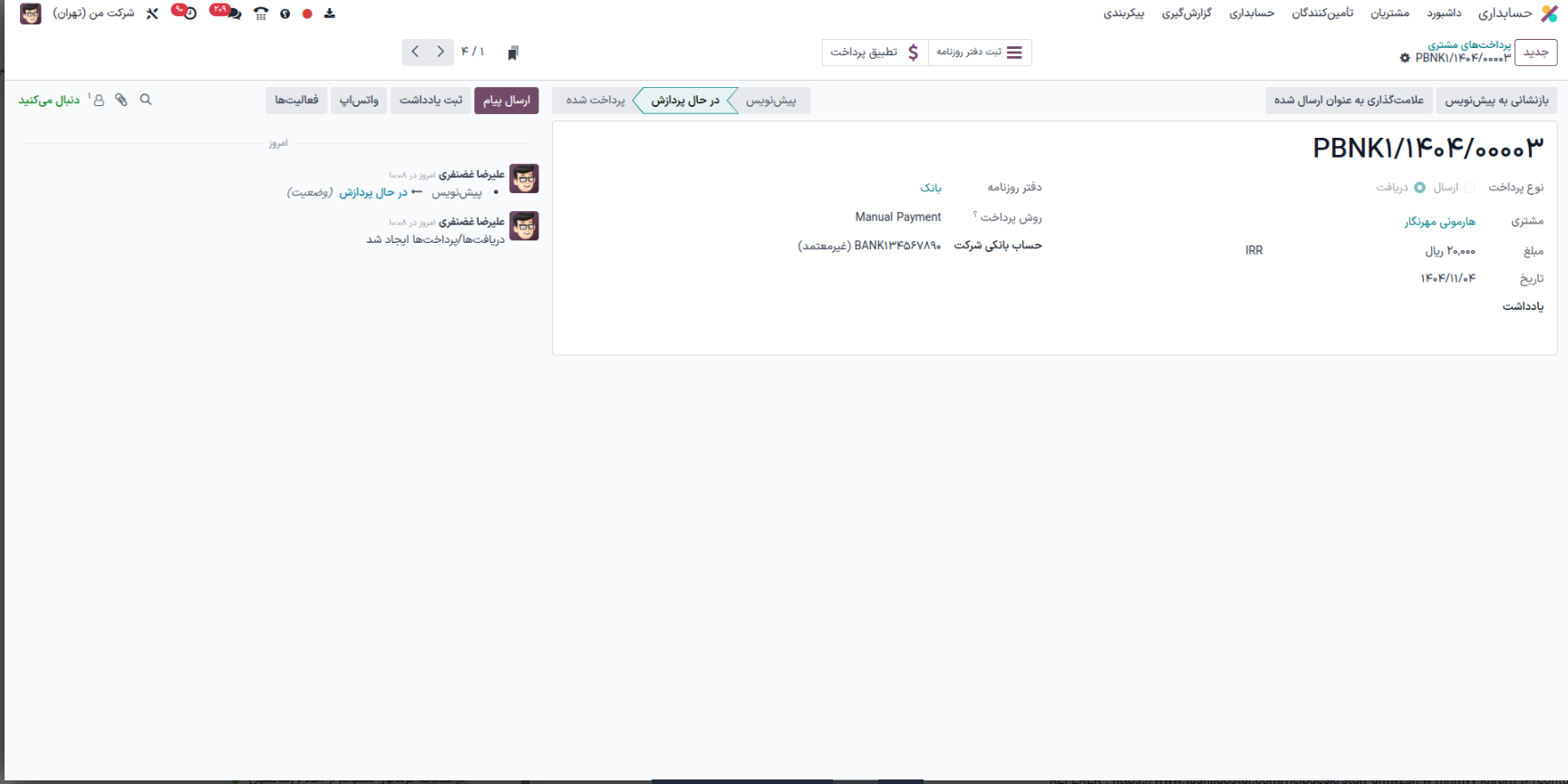 4 ) در مرحله آخر به هنگام دریافت مبلغ از مشتری میتوانید از بخش حسابداری -> مشتریان برای طرف همکار مربوطه مبلغ را دریافت نمایید (مطابق عکس پیوستی) دقت داشته باشید انتخاب حساب دریافت و پرداخت معوق برای نمایش دریافت و پرداختها در دفتر کل طرف همکار عمومی الزامی است.