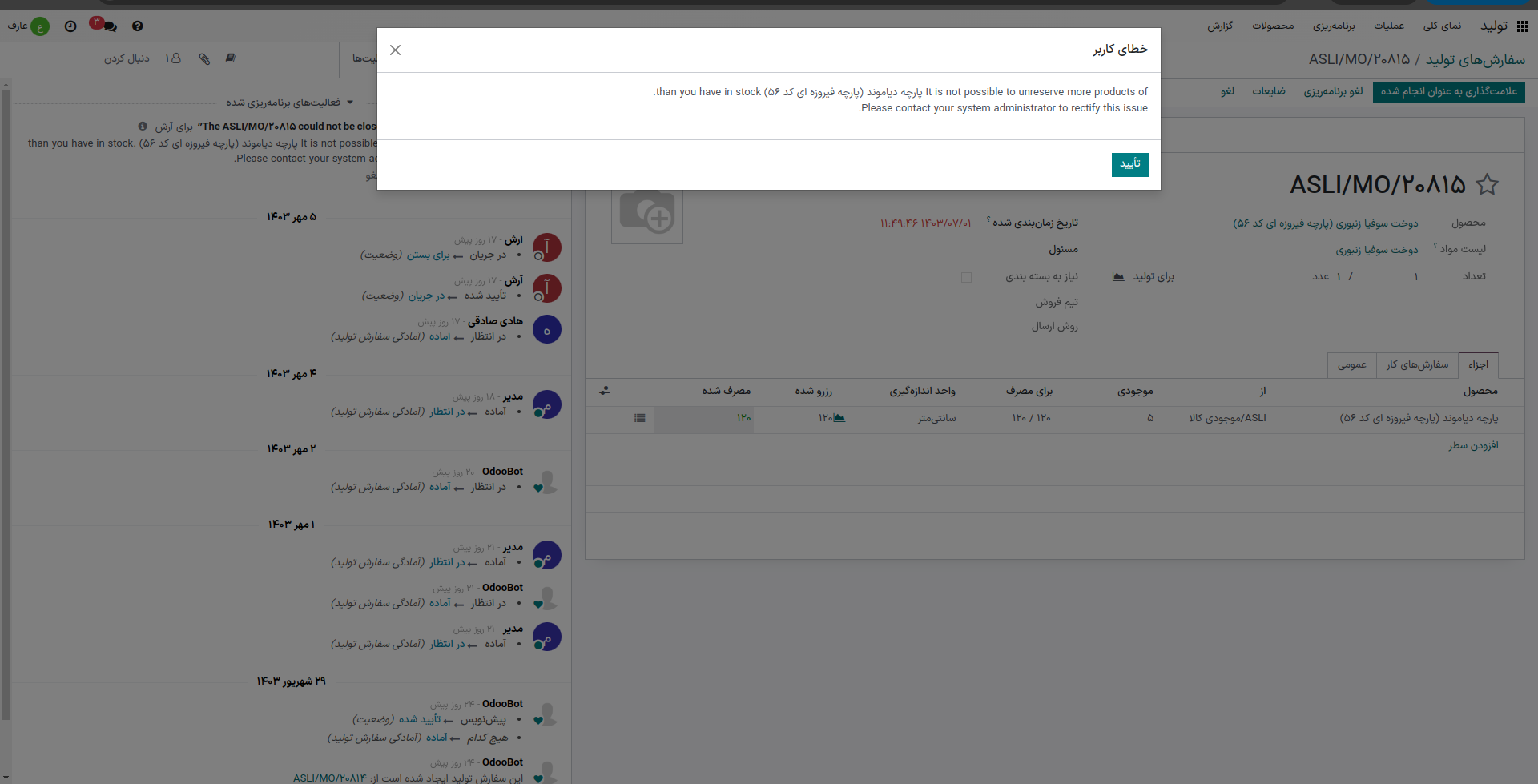 خطای نمایش داده شده برای کاربرانی که در ماژول تولید / کاربر هستند بدین شکل است.
