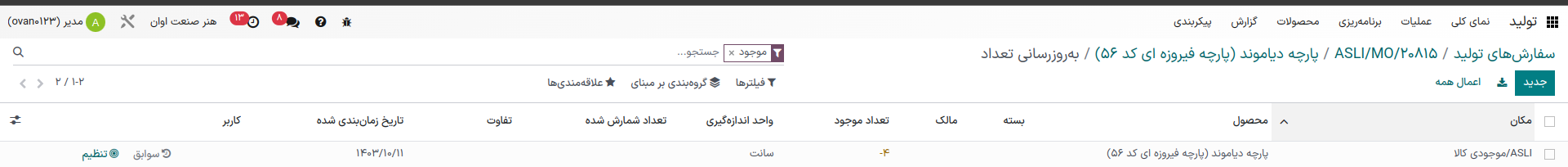 - امکان آزادسازی تعداد بیشتری از محصول "پارچه دیاموند (پارچه فیروزهای کد 56)" نسبت به موجودی انبار شما وجود ندارد.