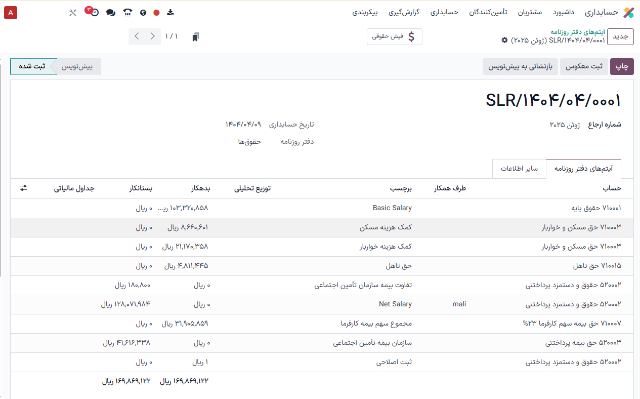 نکته مهم: جهت شناسایی هزینه حقوق و تسویه آن در سیستم، نیاز است در بخش حسابداری > ثبت‌های دفتر روزنامه یک سند دستی ایجاد نمایید.