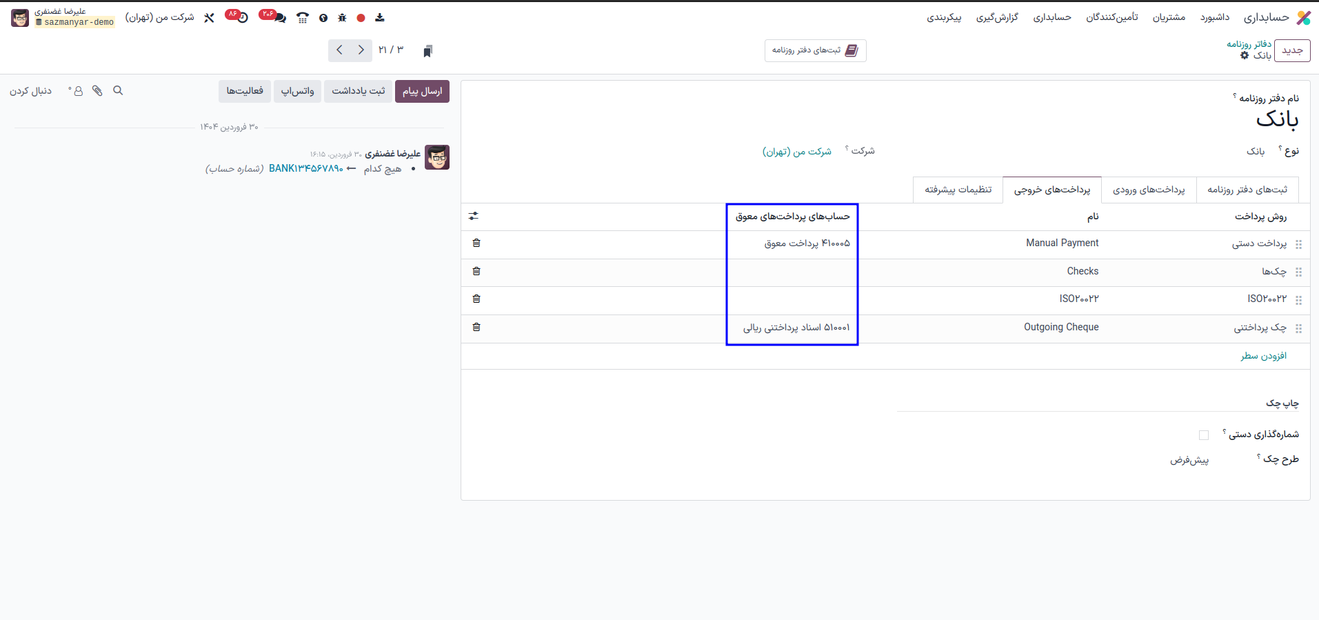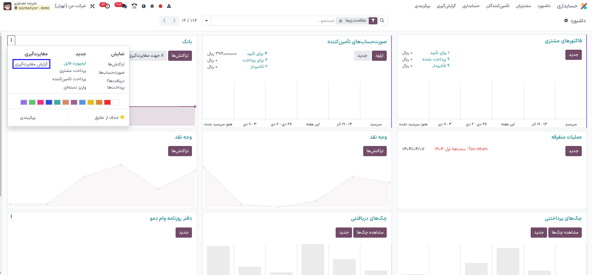 در گزارش مغایرتگیری بانکی،که در مسیر ماژول حسابداری -> داشبورد -> دفتر روزنامه مورد نظر قرار دارد.