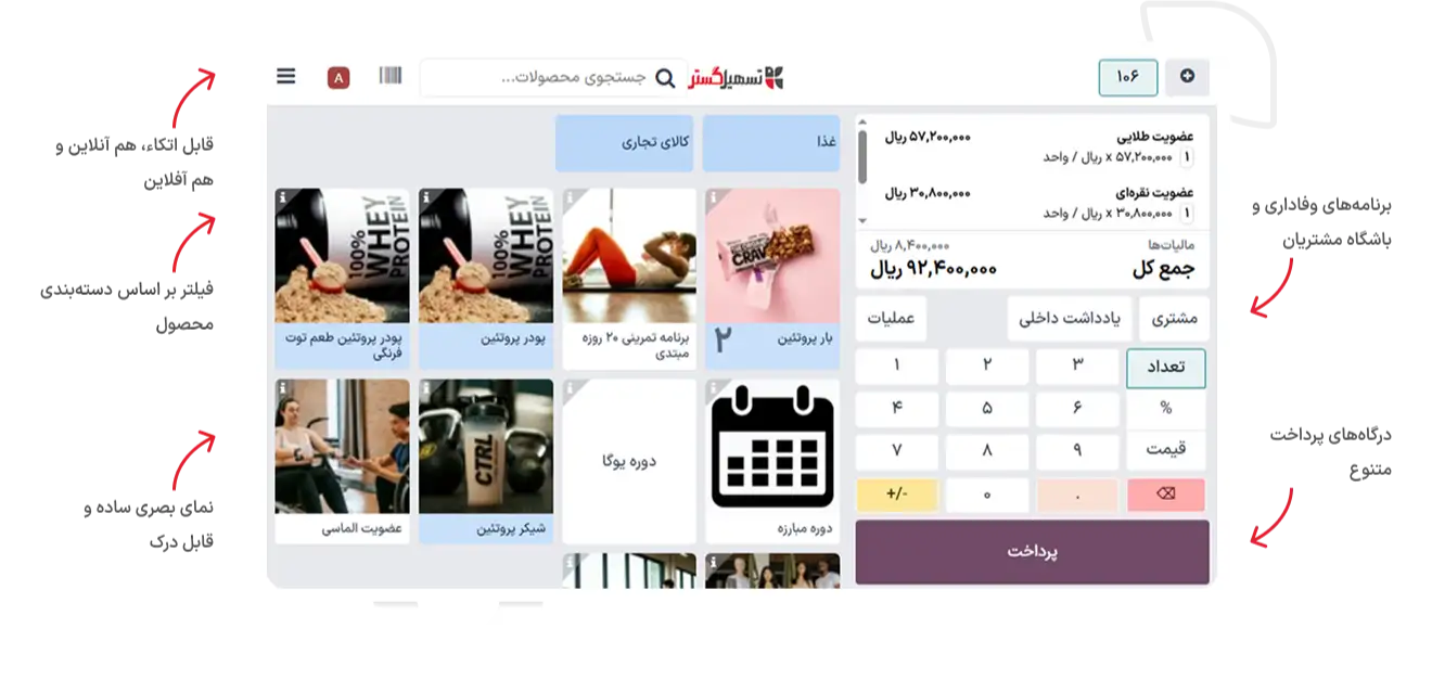سیستم فروش یکپارچه و سریع: با برنامه پیشرفته پایانه فروش (POS)، به مشتریان خود امکان دهید پس از یک جلسه تمرینی، نوشیدنی انرژی‌زا تهیه کنند یا لوازم ورزشی، پوشاک، و بلیت‌های کلاس را مستقیماً از باشگاه خریداری کنند.