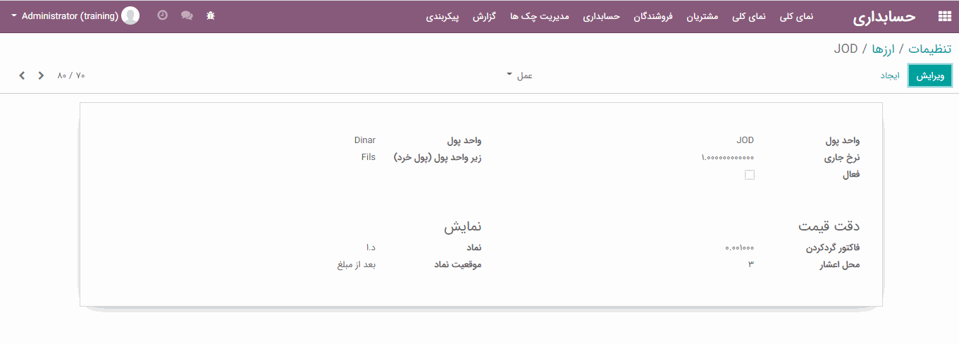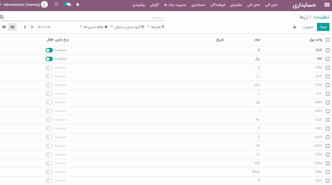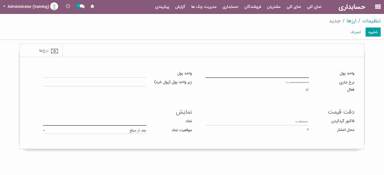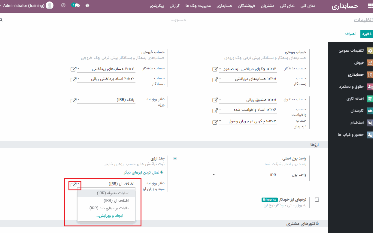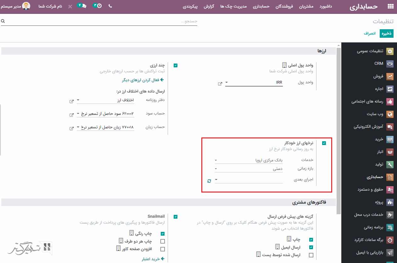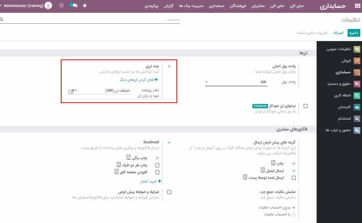 به ماژول حسابداری> پیکربندی> تنظیمات> تب ارزها بروید و گزینه "چند ارزی" را فعال کنید، سپس بر روی دکمه "ذخیره" کلیک کنید: