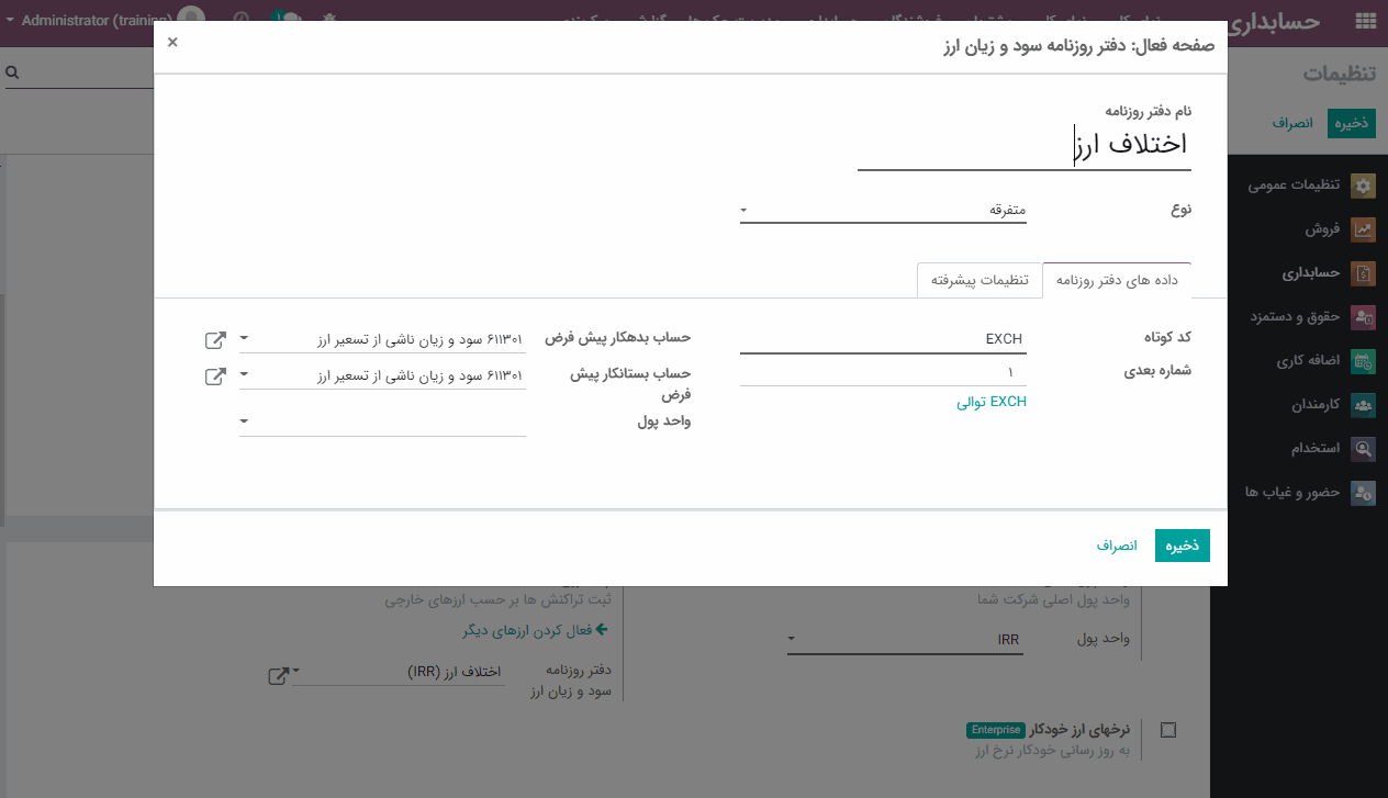 اودوو گزینه های مختلفی مانند عملیات متفرقه (IRR)، اختلاف ارز(IRR)، مالیات بر مبنای نقد (IRR)، فراهم کرده است. همچنین می توانید با کلیک بر روی "ایجاد و ویرایش" دفتر روزنامه جدیدی ایجاد کنید: