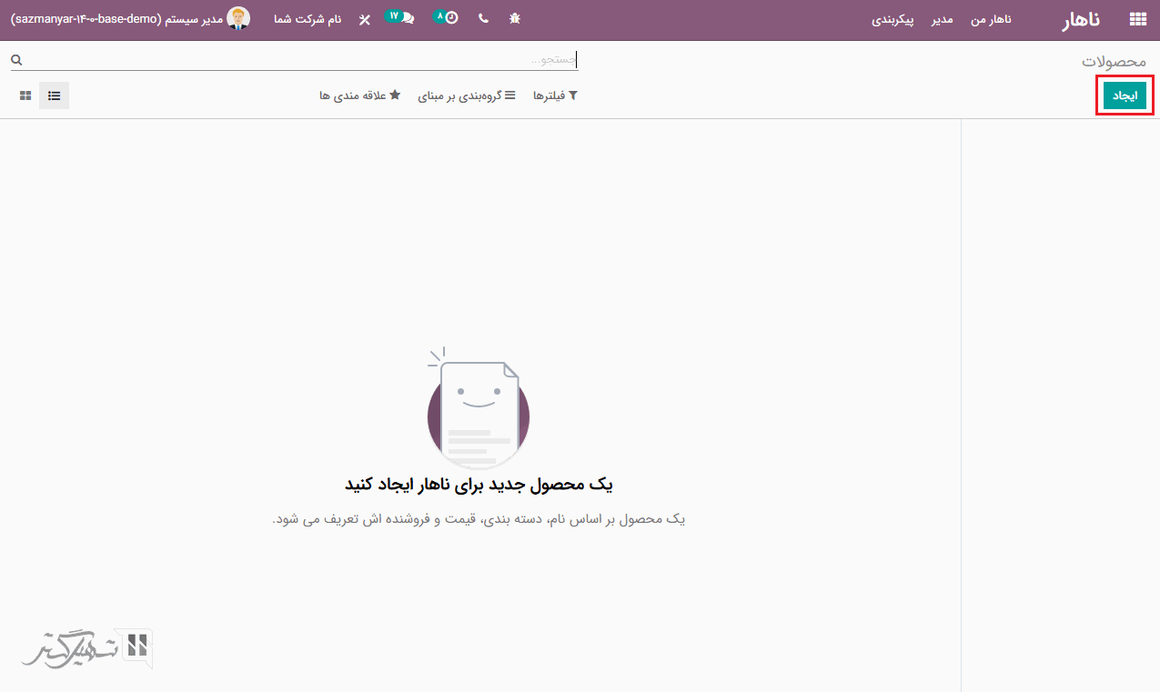 برای ایجاد دسته بندی جدید، بر روی دکمه "ایجاد" کلیک کنید، بعد از پر کردن فیلدهای مربوطه از جمله نام دسته بندی محصول، شرکت و .. بر روی دکمه "ذخیره" کلیک کنید: