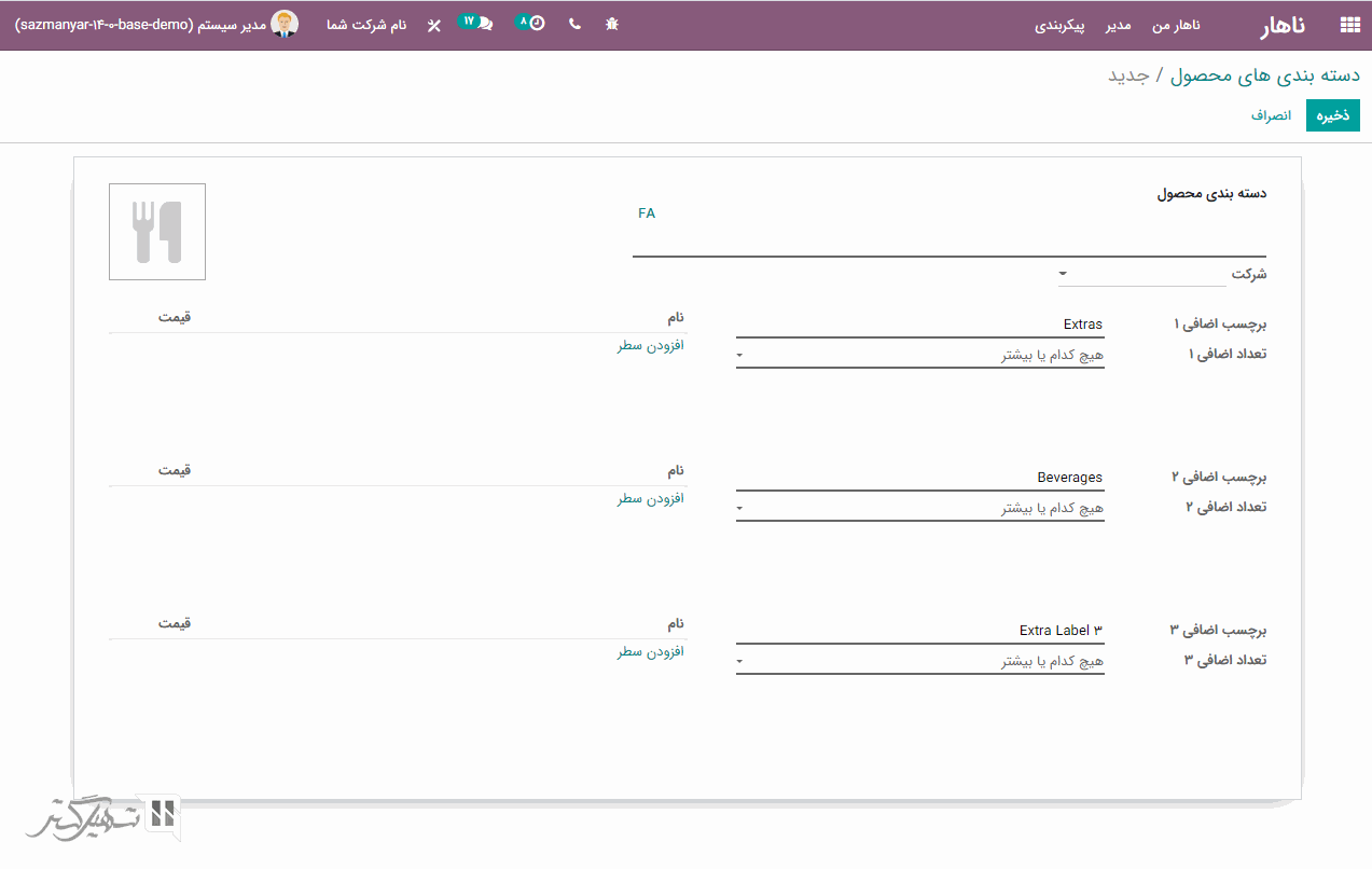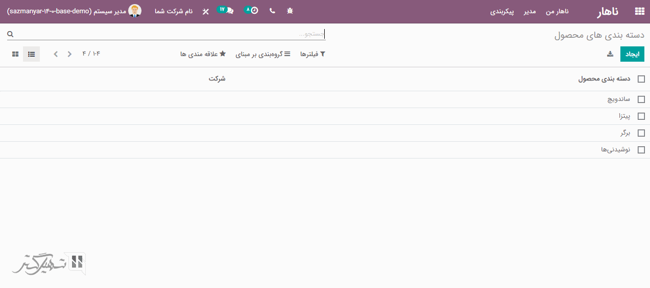 شما می توانید از طریق ماژول ناهار> پیکربندی> دسته بندی های محصول، دسته بندی های مختلفی ایجاد کنید: