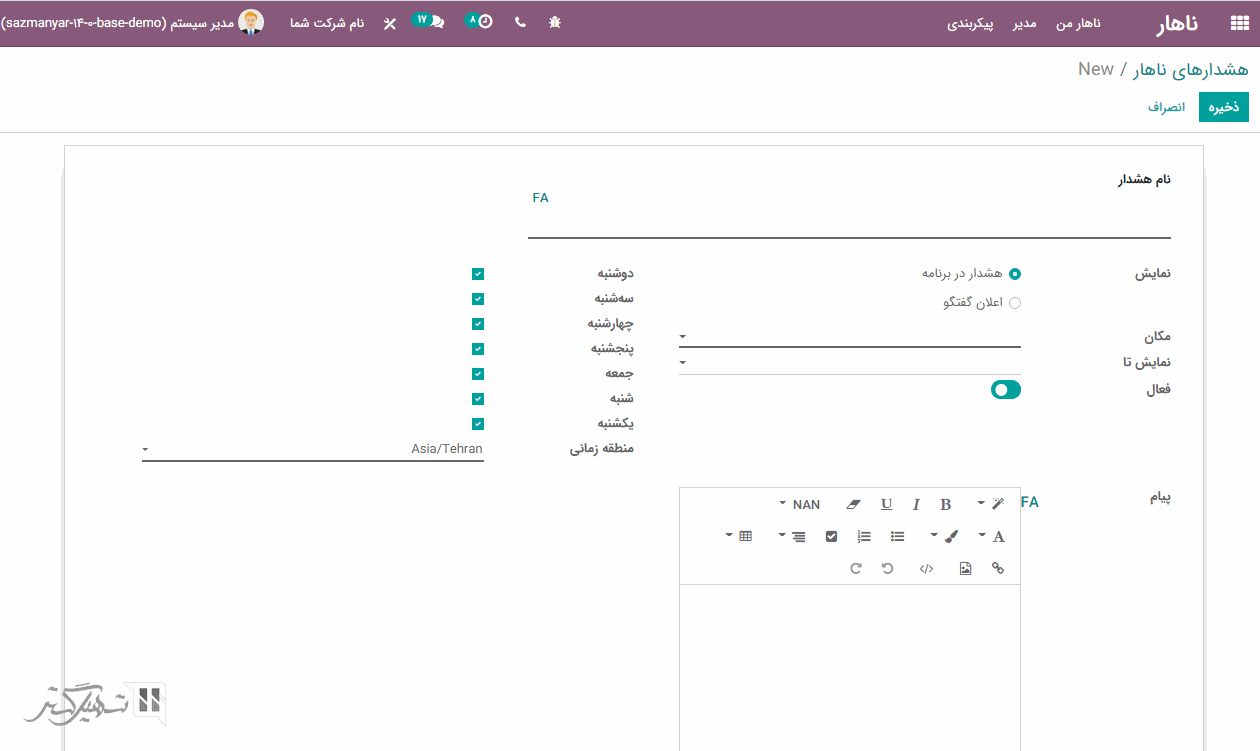 در بعضی مواقع ممکن است کارمند سفارش مواد غذایی خود را فراموش کند. این امر می تواند باعث تاخیر در فرآیند سفارش و تحویل آن شود. ماژول ناهار اودوو برای جلوگیری از چنین شرایطی، ویژگی "هشدارها" را ارائه داده است. با استفاده از این ویژگی، می توانید از طریق ماژول ناهار> پیکربندی> اخطارها، پیام های هشدار را برای جلوگیری از تأخیر در ثبت سفارش ها، ایجاد کنید.