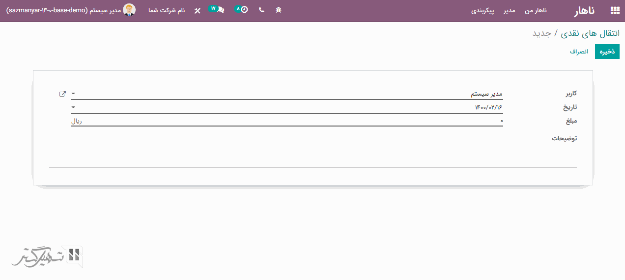 با کلیک بر روی دکمه "ایجاد"، می توانید انتقال های نقدی جدیدی ایجاد کنید. در فرم ایجاد، نام کاربر، تاریخ، مبلغ و توضیحات را اضافه کنید، سپس بر روی دکمه "ذخیره" کلیک کنید:
