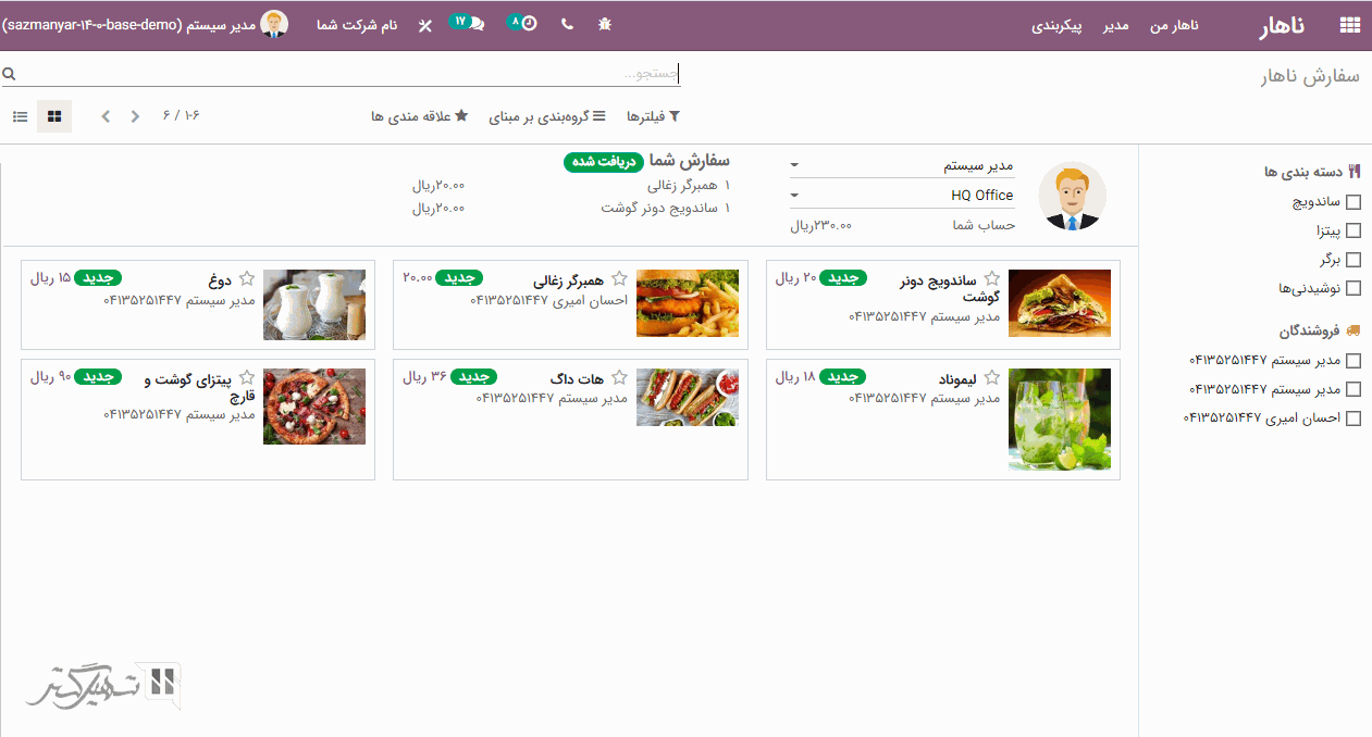 کاربر می تواند با استفاده از ماژول ناهار، سفارش ها و تاریخچه سفارش ها را ایجاد کند.