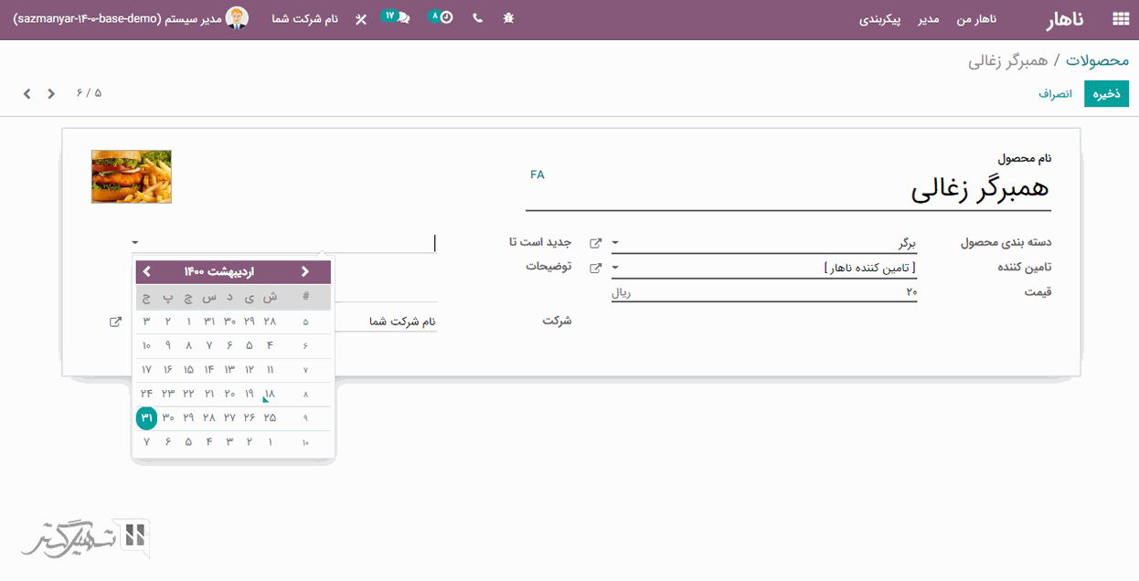 برای ایجاد محصول جدید، بر روی دکمه "ایجاد" کلیک کنید. در فرم ایجاد، کاربر می تواند نام محصول، تصویر محصول، دسته بندی محصول، تامین کننده پیش فرض و قیمت محصول را اضافه کند. در فیلد "جدید است تا" می توانید اعتبار سفارش را تنظیم کنید. بعد از پر کردن فیلدهای مربوطه، بر روی دکمه "ذخیره" کلیک کنید: